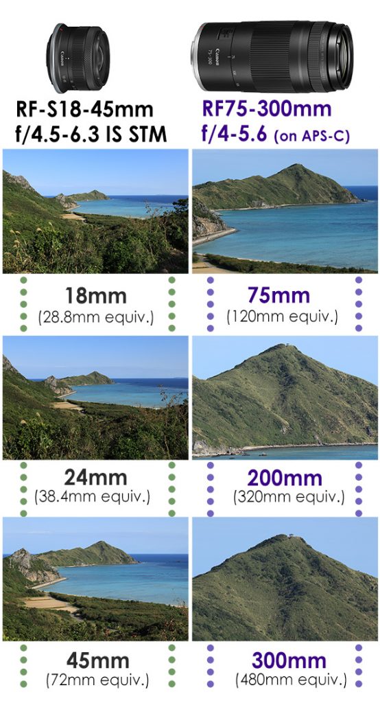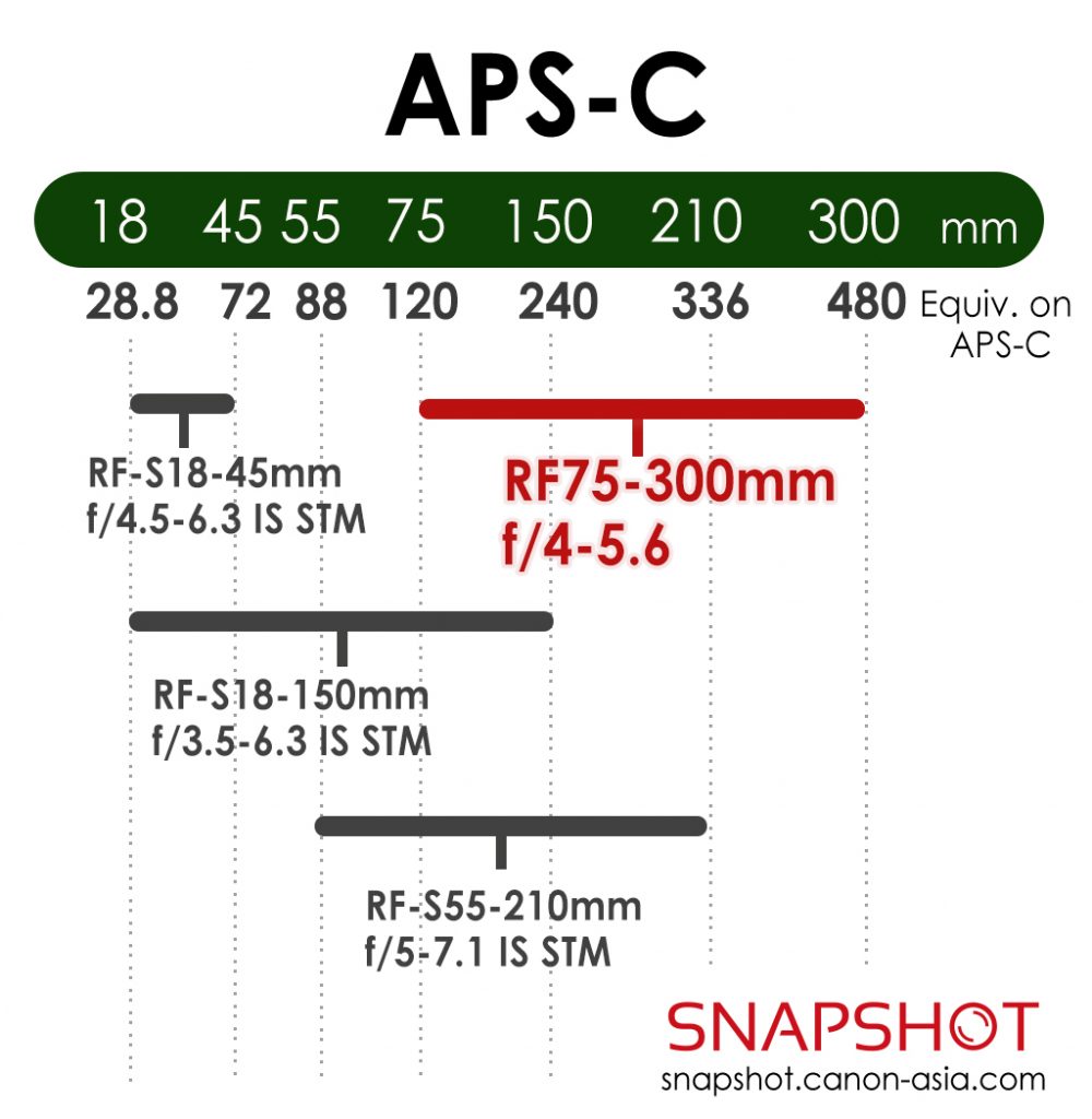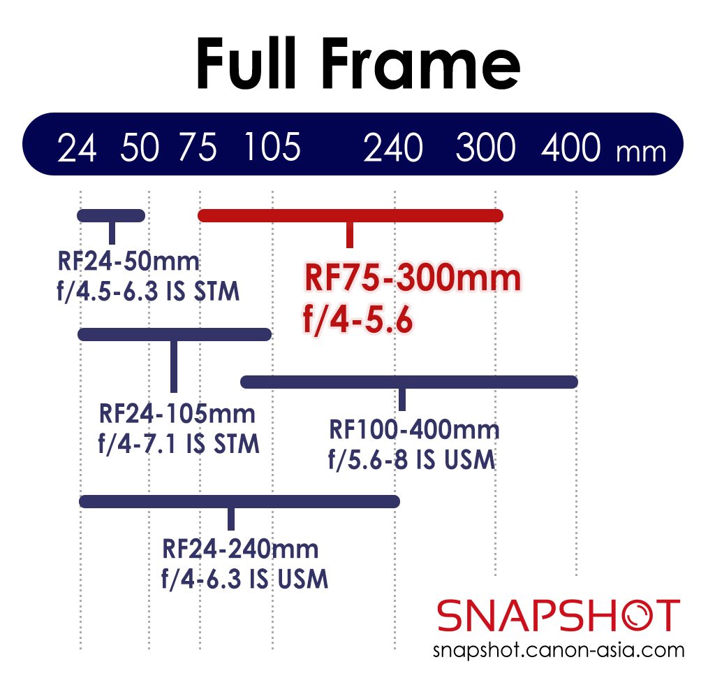 Các sơ đồ bên dưới cho thấy dải tiêu cự RF 75-300mm f/4-5.6 so với ống kính theo bộ của bạn và các ống kính zoom tele khác cùng loại.