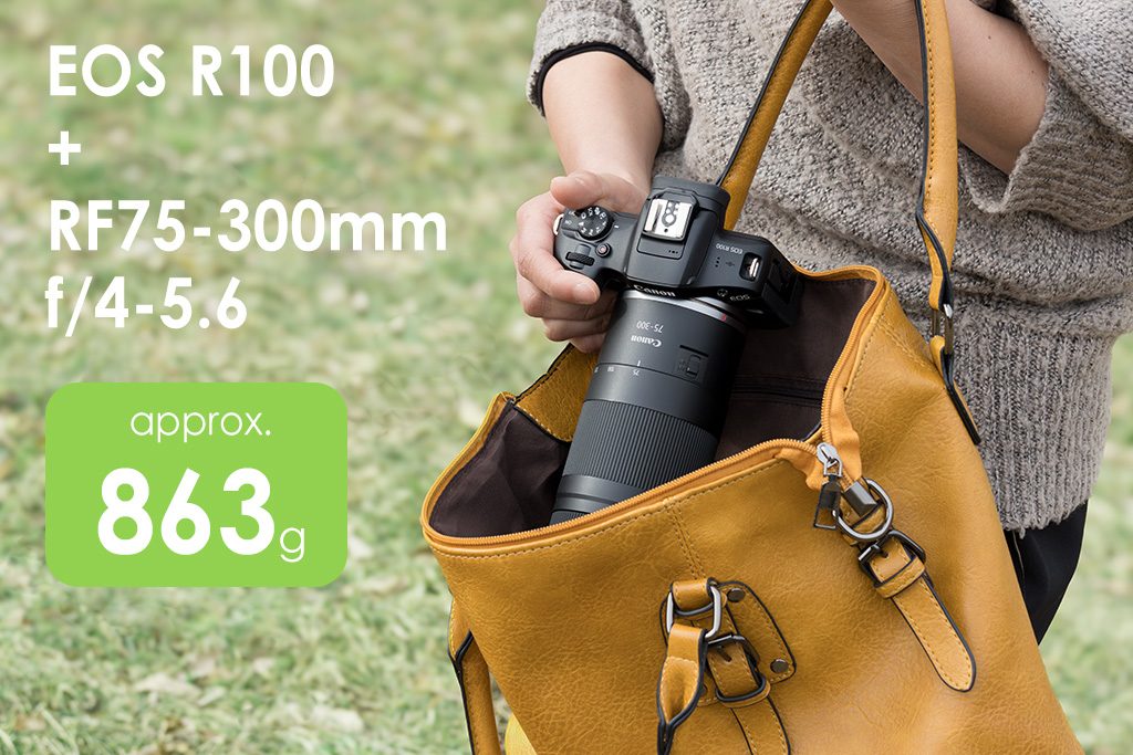 Chỉ dài khoảng 14,6cm và nặng gần bằng chai nước 500ml ở xấp xỉ 507g, RF 75-300mm f/4-5.6 tạo thành sự kết hợp nhẹ ký dưới 1kg với các máy ảnh như EOS R50, EOS R10, và EOS R100. Nó có thể xếp gọn dễ dàng vào túi đựng máy ảnh thông thường: tuyệt vời cho các chuyến đi dạo trong thiên nhiên và trang bị nhẹ khi di chuyển!