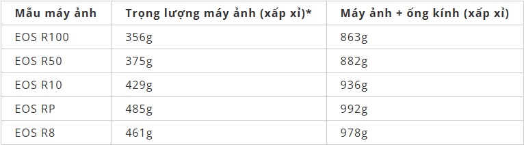 Trọng lượng của RF75-300mm f/4-5.6 với một số máy ảnh phổ biến với người mới bắt đầu