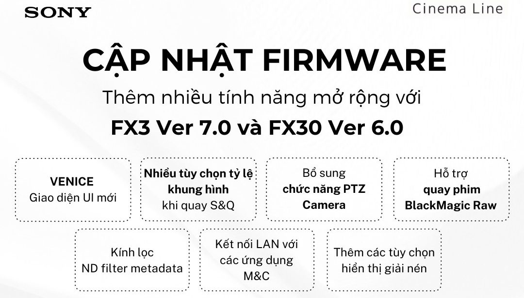 Tải xuống bản cập nhật firmware mới nhất để mở rộng tính năng và nâng cao hiệu suất làm việc cùng Sony! Các lợi ích và cải tiến từ các phiên bản firmware mới cho Sony FX3 (7.0) và Sony FX30 (6.0) ‣ Thêm màn hình chính (BIG6) nơi bạn có