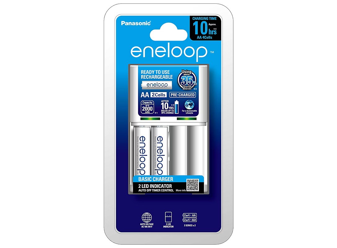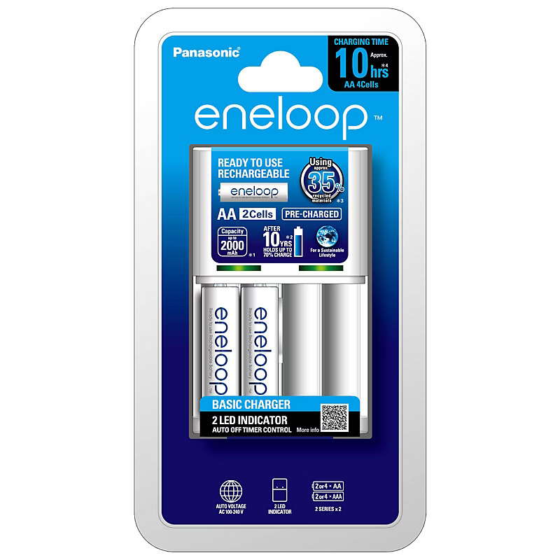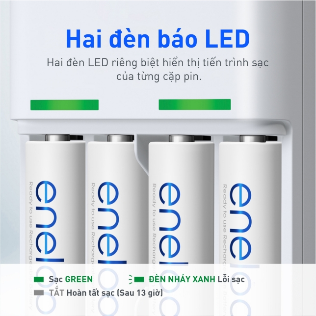 Bạn có thể sạc tối đa bốn viên pin AA/AAA eneloop và eneloop pro cùng lúc theo các kết hợp sau: 2x AA, 4x AA, 2x AAA, 4x AAA, hoặc 2x AA và 2x AAA.