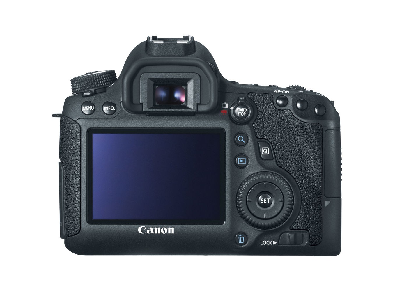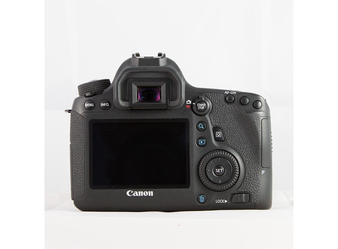 Không có màn hình xoay lật, cụm điều khiển của Canon 6D có nhiều điểm chung với model T4i hơn so với các máy ảnh khác. Canon đã loại bỏ 5 nút bên trái màn hình LCD, xóa nút Picture Styles và RAW/JPEG (từ EOS 7D), và bố trí các nút còn lại như ảnh trên.