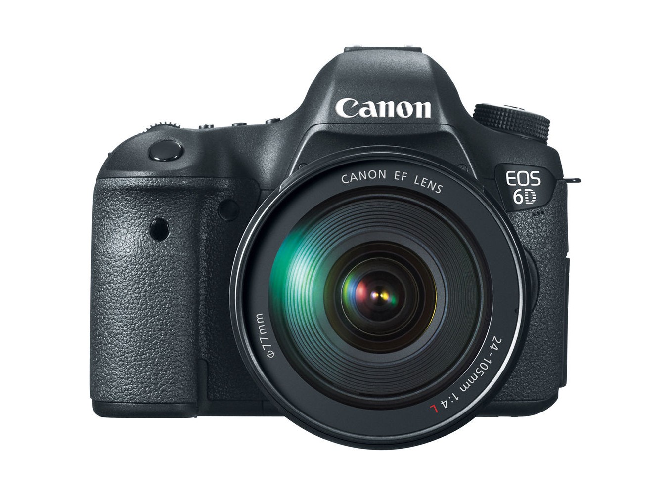 Nhìn từ phía trước, Canon 6D có thiết kế khá đơn giản, ở phần trên nơi có lăng kính kính ngắm hơi gồ ra cùng với logo Canon, trông như một cái trán dô. Không hề có flash tích hợp, điều không bình thường đối với một máy ảnh dành cho người dùng cao cấp, nhưng phù hợp với máy ảnh full-frame Canon. Cổng hồng ngoại được đặt ngay trên phần báng cầm tay, một đèn hẹn giờ (không phải đèn hỗ trợ lấy nét AF) nằm giữa phần báng cầm và ống kính. Nằm hơi chếch bên dưới phía trái của ngàm ống kính là nút xem trước độ sâu trường ảnh, khá nhỏ nên khó nhận thấy. Nút nhả ống kính khá lớn nằm ở vị trí thông thường, và 3 lỗ microphone nằm ngay bên dưới logo.