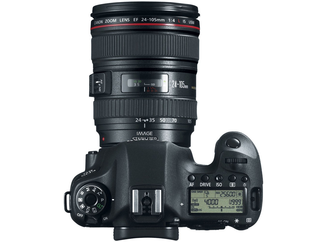 Mode dial có ít tùy chọn hơn so với thông thường, nên khoảng cách giữa các tùy chọn khá lớn, ở giữa vòng xoay chọn chế độ chụp này là nút khóa. Nút nguồn nằm ngay bên dưới Model dial. Giống như trên model Canon 60D, chiếc máy ảnh Canon 6D cũng có một dãy các nút nằm phía trên màn hình phụ để chỉnh nhanh các thiết lập thông số chụp. Thông tin về Wi-Fi và GPS cũng như chế độ HDR cũng hiển thị trên màn hình này.