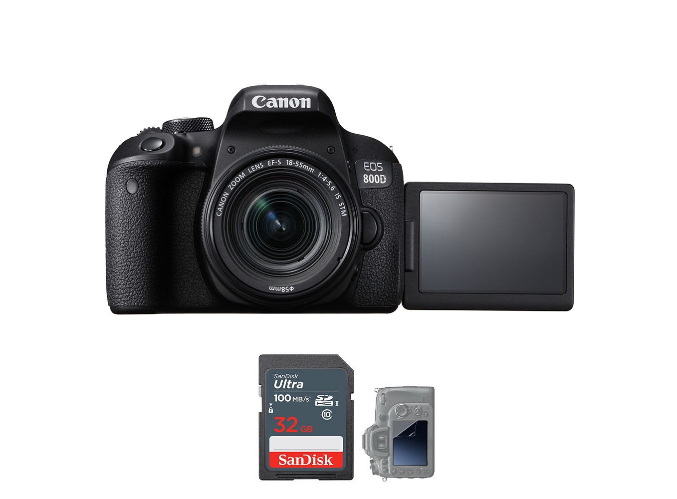 Bao gồm ống kính Canon EF-S 18-55mm F/4-5.6 IS STM cung cấp tiêu cự tương đương 28.8-88mm theo định dạng 35mm, bao gồm hàng loạt các góc độ chụp từ góc rộng đến chân dung. Thiết kế của ống kính tích hợp cơ chế lấy nét STM cho khả năng lấy nét yên tĩnh và trơn tru, chính xác. Ngoài ra hệ thống ổn định hình ảnh quang học giúp giảm thiểu sự xuất hiện của máy ảnh bị rung lên đến 4 bước, cho phép màn trập làm việc hiệu quả ngay cả khi điều kiện chụp thiếu sáng và với độ phóng đại lớn.