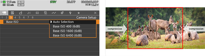 Tính năng Tự động chọn của máy quay thay đổi giữa ba mức ISO cơ bản tùy thuộc vào cảnh, chọn mức có tỷ lệ S/N cao hơn trong khi vẫn duy trì dải động. Người dùng cũng có thể chọn thủ công từ ba mức ISO cơ bản*: ISO 400, ISO 1600 và ISO 6400.