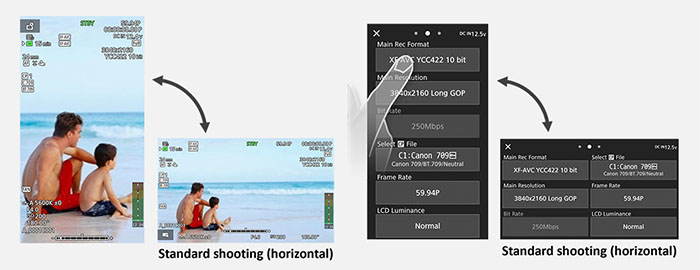 Máy ảnh cung cấp menu cảm ứng để ghi lại các tính năng và cài đặt độ sáng LCD, mang lại cảm giác giống như chụp ngang tiêu chuẩn. Tính năng này đặc biệt hữu ích để sản xuất video cho các thiết bị thông minh hoặc biển báo kỹ thuật số. Máy ảnh cũng hỗ trợ cài đặt menu và điều chỉnh độ sáng LCD khi chụp dọc, mang lại bố cục dễ đọc tương tự như chụp ngang tiêu chuẩn. Có thể vận hành nhiều cài đặt và điều khiển khác nhau bằng cảm ứng.