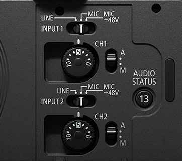 EOS C80 có nút xoay chuyên dụng ở mặt sau thân máy để điều khiển âm thanh chính xác, cho phép điều chỉnh mức ghi âm cho kênh 1 và 2 một cách dễ dàng và trực quan.