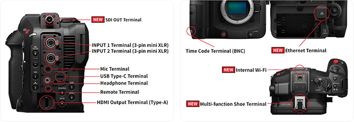 Thiết bị đầu cuối SDI mới tích hợp cho phép xuất đồng thời cùng với thiết bị đầu cuối HDMI, cung cấp khả năng kết nối liền mạch với nhiều thiết bị bên ngoài. Ngoài ra, với thiết bị đầu cuối Wi-Fi và Ethernet tích hợp của máy ảnh, người dùng có thể dễ dàng vận hành máy ảnh từ xa và theo dõi trạng thái của máy từ điện thoại thông minh hoặc máy tính, mở ra các cấp độ linh hoạt và kiểm soát mới.