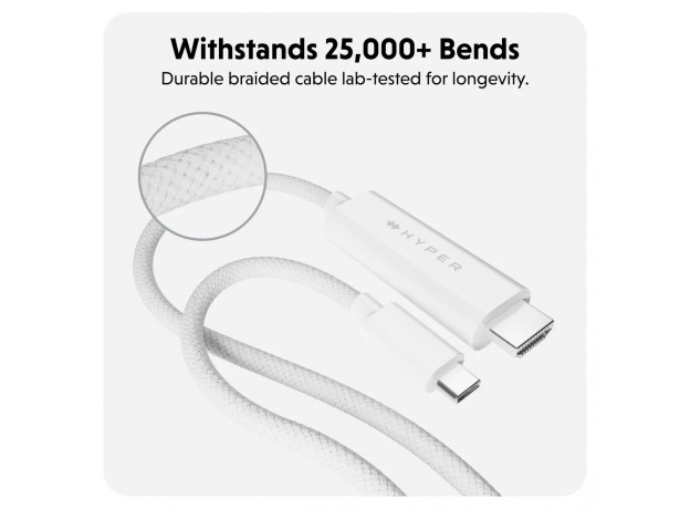 Cáp dữ liệu HyperDrive USB-C to HDMI 4K60Hz 2.5m (HD6007) kết nối trực tiếp thiết bị USB-C của bạn với màn hình HDMI. Dòng cáp phổ thông này cho phép bạn dễ dàng chia sẻ nội dung 4K HDR10 mà không cần bộ chuyển đổi. Cáp USB-C sang HDMI có cáp bện bền dài 2,5m đã được thử nghiệm chịu được hơn 25,000 lần uốn cong. Với khả năng tương thích USB-C phổ thông, cáp cho phép người dùng iPhone 15, iPad, Android và các thiết bị USB-C khác chỉ cần kết nối và bắt đầu hiển thị phương tiện ở chế độ HDR 4K60Hz trực tiếp từ thiết bị di động của họ - hoàn hảo cho người sáng tạo video, thuyết trình, game thủ...