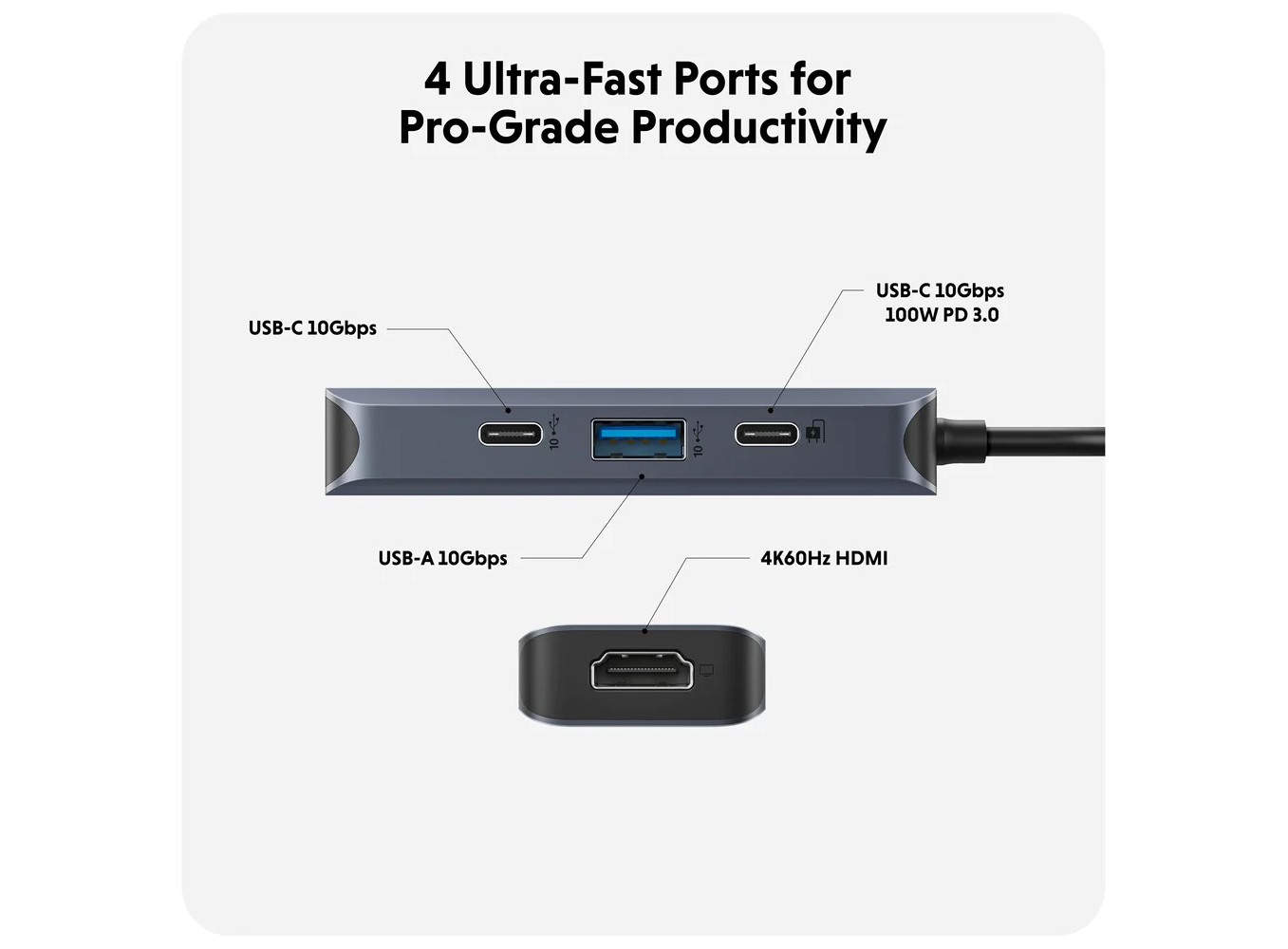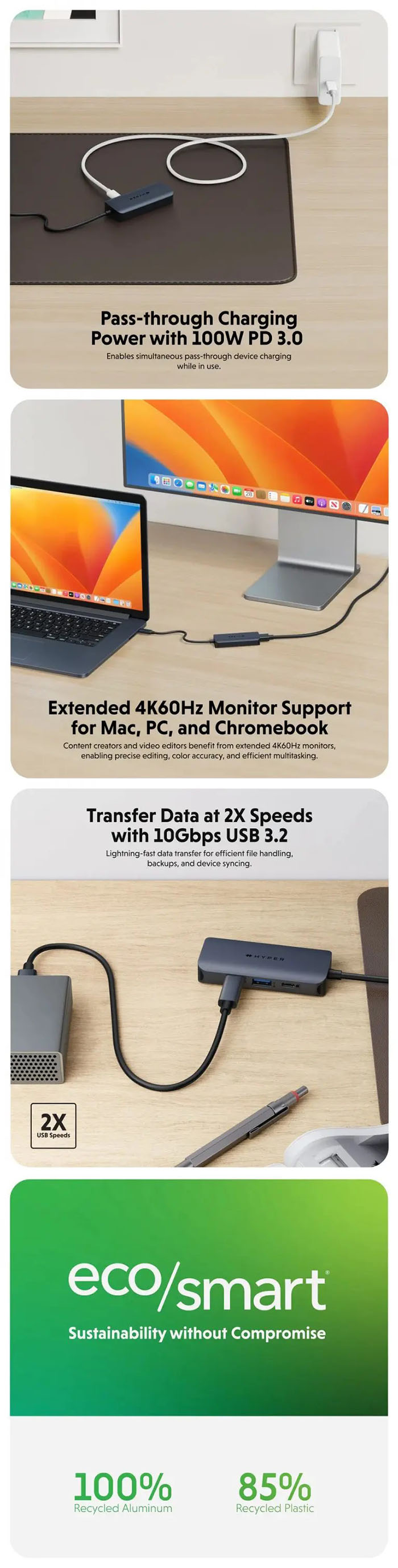 Sạc thiết bị của bạn lên đến 85W với bộ sạc 100W PD 3.0 (khi kết nối với PD 3.0 Host) trong khi sử dụng hub, đảm bảo năng suất không bị gián đoạn, làm cho nó lý tưởng cho các thiết bị đòi hỏi sạc công suất cao và những người làm việc bận rộn khi đang di chuyển.