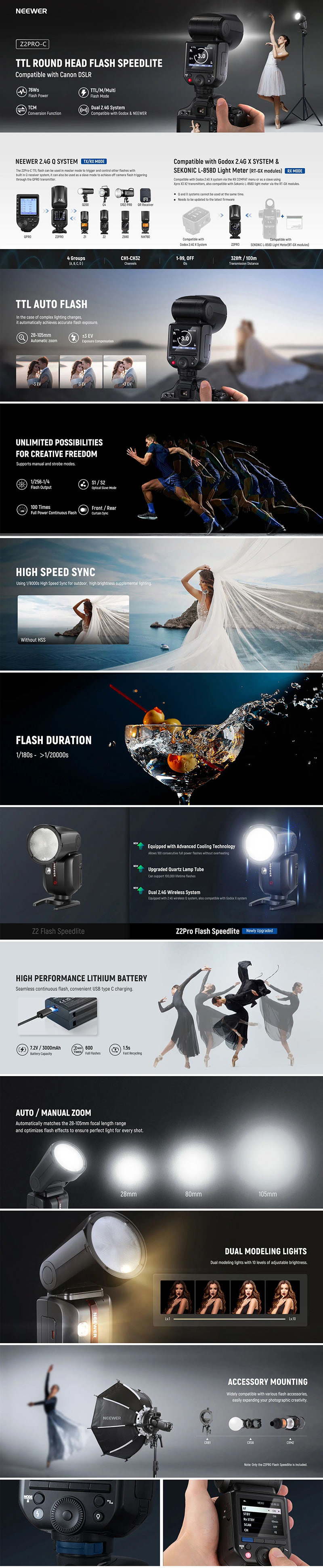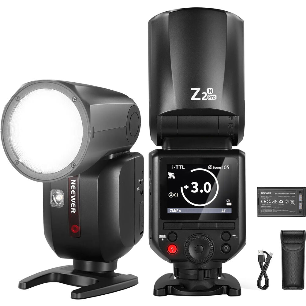 Neewer cải tiến đèn flash Z2 gắn trên đế phổ biến của họ với đèn flash Speedlite đầu tròn Z2PRO TTL. Đèn flash Z2PRO có cùng công suất 76W và thời gian hồi đèn nhanh 1,5 giây so với phiên bản tiền nhiệm. Một trong những điểm nổi bật của phiên bản PRO là khả năng làm mát hiệu quả, đảm bảo thực hiện tới 100 lần nháy liên tục mà không bị quá nhiệt. Đèn flash cũng có số lần nháy tối đa là 600 lần. Cuối cùng, ống thạch anh được nâng cấp của đèn flash hỗ trợ tới 100,000 lần nháy trong suốt thời gian sử dụng. Một điểm quan trọng khác là hệ thống không dây kép 2.4 GHz giúp đèn tương thích với cả Neewer Q cũng như hệ thống Godox X. Z2PRO không chỉ cung cấp một mà là hai đèn LED mô hình tích hợp và chuyển đổi TCM để nhanh chóng chuyển từ chế độ nháy TTL sang chế độ nháy thủ công. Phiên bản PRO vẫn là một đèn flash dễ sử dụng, nhưng ở đây bạn sẽ có hiệu suất tốt hơn và các tính năng nâng cao để làm sáng bừng các buổi chụp ảnh của mình.