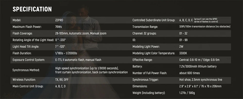 Z2PRO-C cung cấp công suất mạnh mẽ 76W và được trang bị hệ thống tản nhiệt hiệu quả, cho phép đánh liên tục 100 lần với công suất tối đa mà không bị quá nhiệt. Ống thạch anh tiên tiến hỗ trợ lên đến 100.000 lần đánh. Đầu đèn flash được cải thiện nhiệt độ màu, đảm bảo tái tạo màu sắc chân thực, có thể xoay 330° và nghiêng từ -7 đến 120° để tạo hiệu ứng phản chiếu linh hoạt. Hai đèn LED 2W 3300K cung cấp 10 mức độ sáng (01-10).