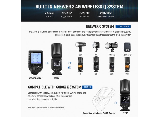 Điều khiển không dây bốn nhóm (A/B/C/D), 32 kênh và 99 ID với bộ phát QPRO TTL (không bao gồm), hoặc làm bộ phận chủ/tớ cho đèn flash hệ thống Q lên đến 100m. Tương thích với hệ thống Godox 2.4G X (menu RX COMPAT) hoặc làm bộ phận tớ bằng bộ phát Xpro X3 X2. Tương thích với máy đo sáng Sekonic L-858D (mô-đun RT-GX). Lưu ý: Không thể sử dụng đồng thời hệ thống Q và X; cần có firmware mới nhất để tương thích.