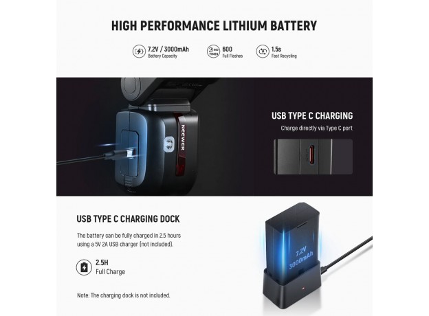 Pin lithium 7.2V/3000mAh cung cấp 600 lần nháy công suất tối đa, thời gian hồi đèn nhanh 1,5 giây và thời lượng nháy từ 1/180 đến 1/20000 giây. Pin được trang bị cổng Type C để sạc ngoài và có thể sạc trong 2,5 giờ bằng bộ sạc USB 5V 2A (không kèm sẵn).
