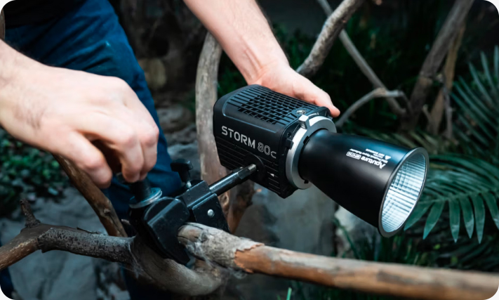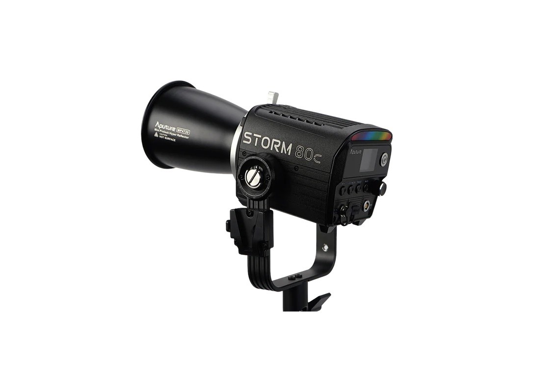 STORM 80c có thể được cấp nguồn từ pin AC, V-mount hoặc USB-C. Aputure tạo ra một giá đỡ cầm tay STORM 80c tùy chọn, với đế pin V-mount và cáp D-Tap. STORM 80c cũng có cổng USB-C 100W để cấp nguồn trực tiếp từ các bộ sạc dự phòng giá rẻ và nhẹ.