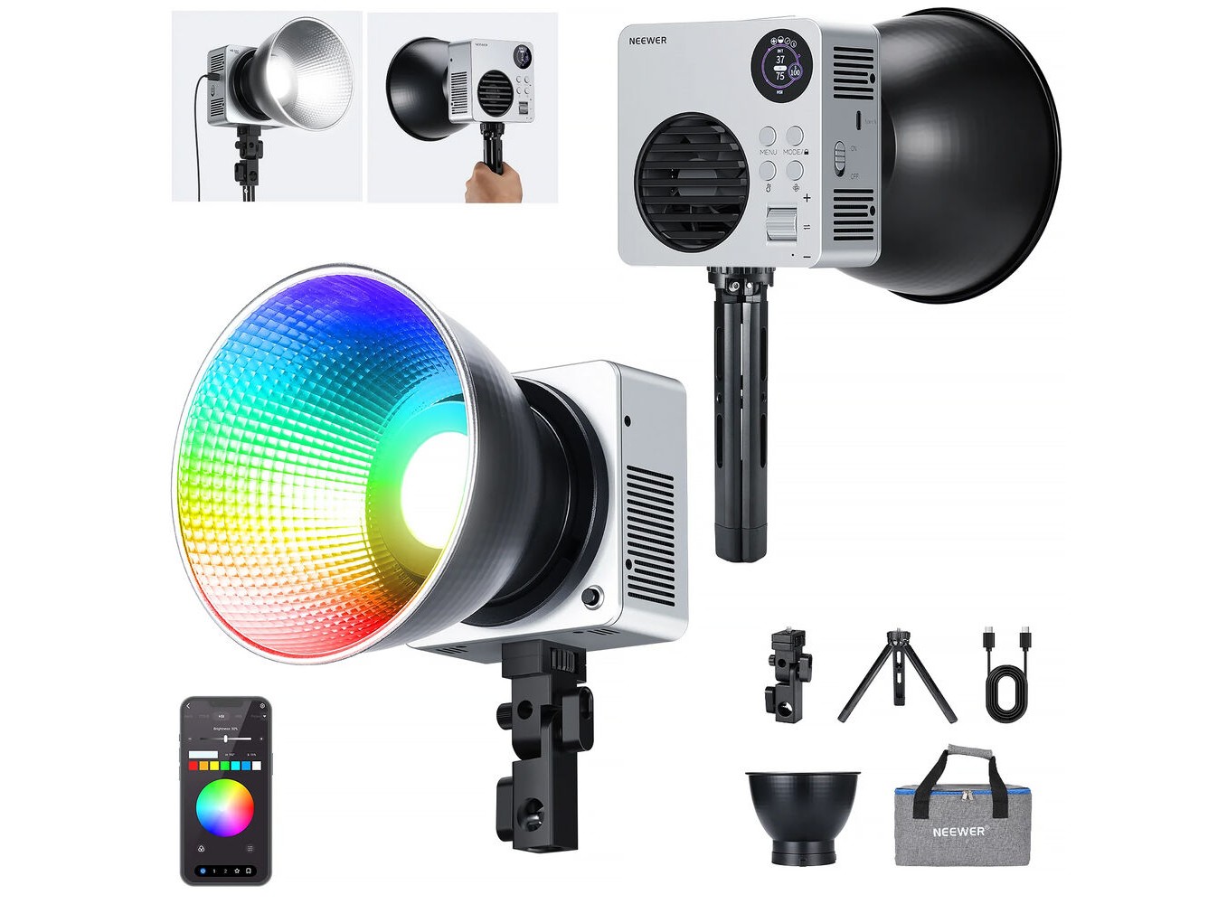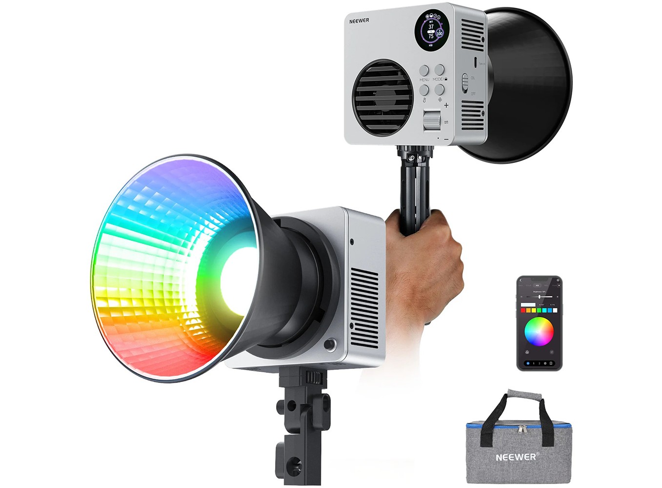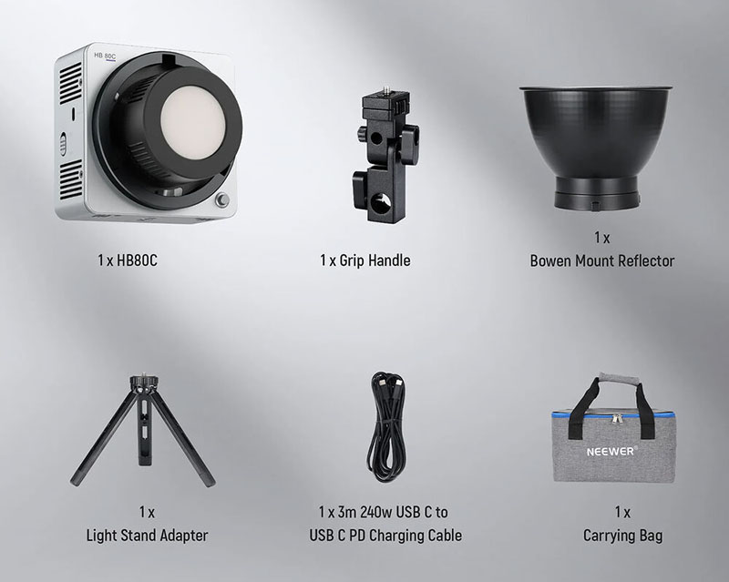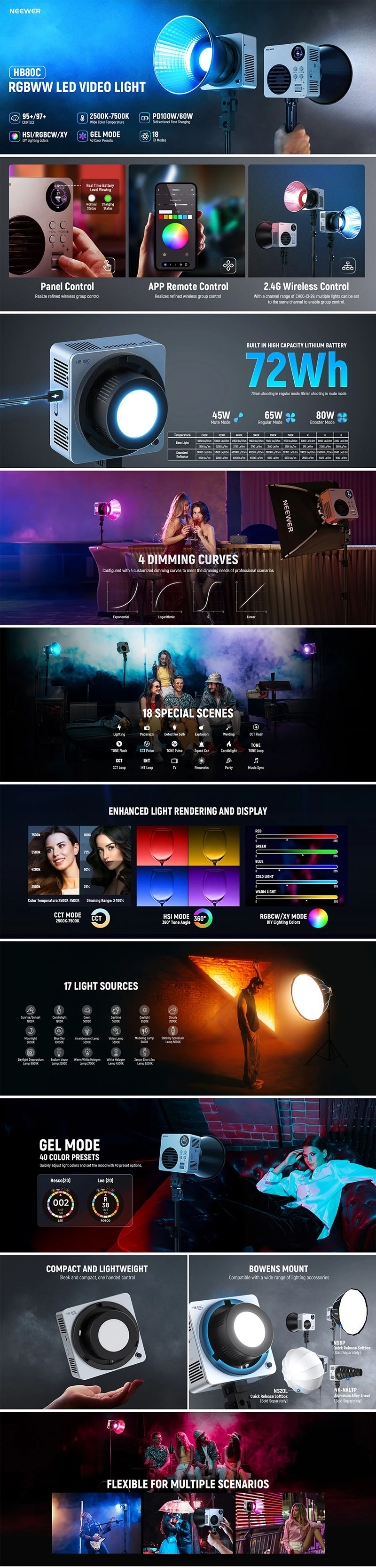 Nhỏ gọn và công suất cao, bộ đèn LED đơn sắc cơ bản Neewer HB80C mang đến ánh sáng rộng và đầy màu sắc cho những người sáng tạo nội dung và vlogger. Với công suất mạnh mẽ 10,400 lux ở 1m cùng phản quang đi kèm, HB80C chiếu sáng rộng rãi trong các cảnh quay di động, bao gồm phỏng vấn đường phố, đám cưới và sự kiện phát trực tiếp ngoài trời. Với công nghệ pha trộn RGBWW, đèn đơn sắc này sử dụng hiệu chỉnh dịch chuyển màu xanh lá cây/đỏ tươi để tạo ra ánh sáng có màu chính xác. Dễ dàng vận chuyển và cầm nắm bằng tay cầm đi kèm, HB80C có thể được cấp nguồn bằng cáp USB-C đi kèm hoặc pin ngàm V bán riêng. Hoặc, sử dụng bộ sạc USB Type-C Xcellon Mighty Mini 165 65W GaN có bán riêng cùng với cáp USB-C để sạc đèn. Khả năng điều chỉnh nhiệt độ màu 2500-7500K, 7 chế độ chiếu sáng và 18 hiệu ứng ánh sáng đặc biệt mang đến các tùy chọn chiếu sáng độc đáo cho thời gian chạy lên đến 70 phút. Khả năng điều khiển tích hợp, không dây và ứng dụng cho phép điều khiển đèn từ xa. Để kiểm soát ánh sáng tốt hơn, gắn bộ điều chỉnh ánh sáng bằng ngàm Bowens của đèn.