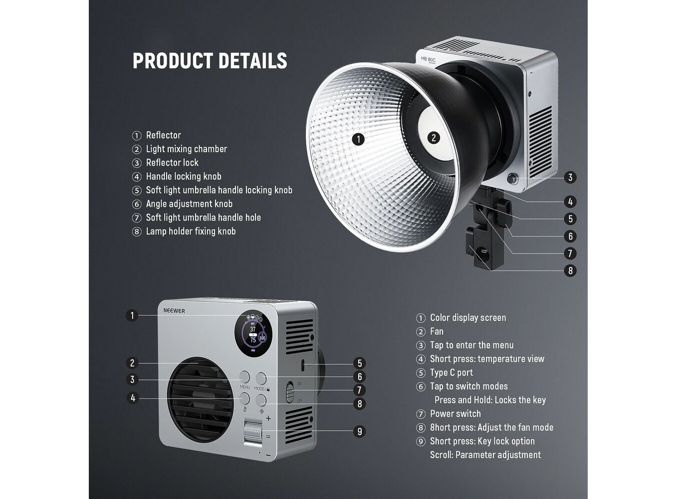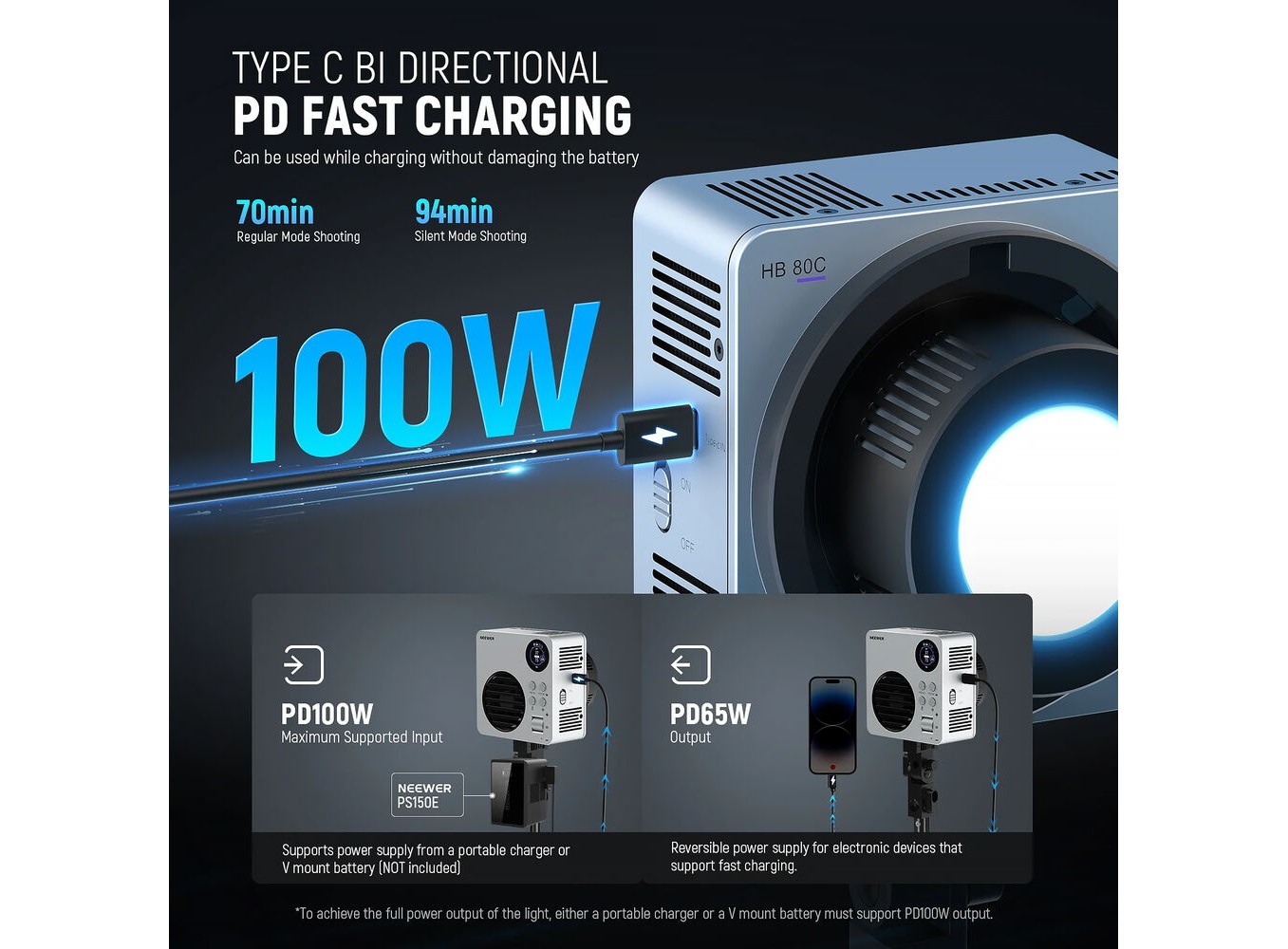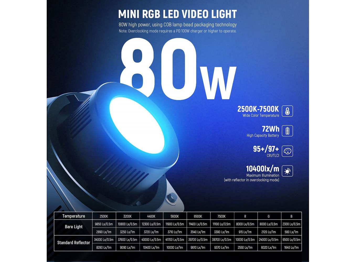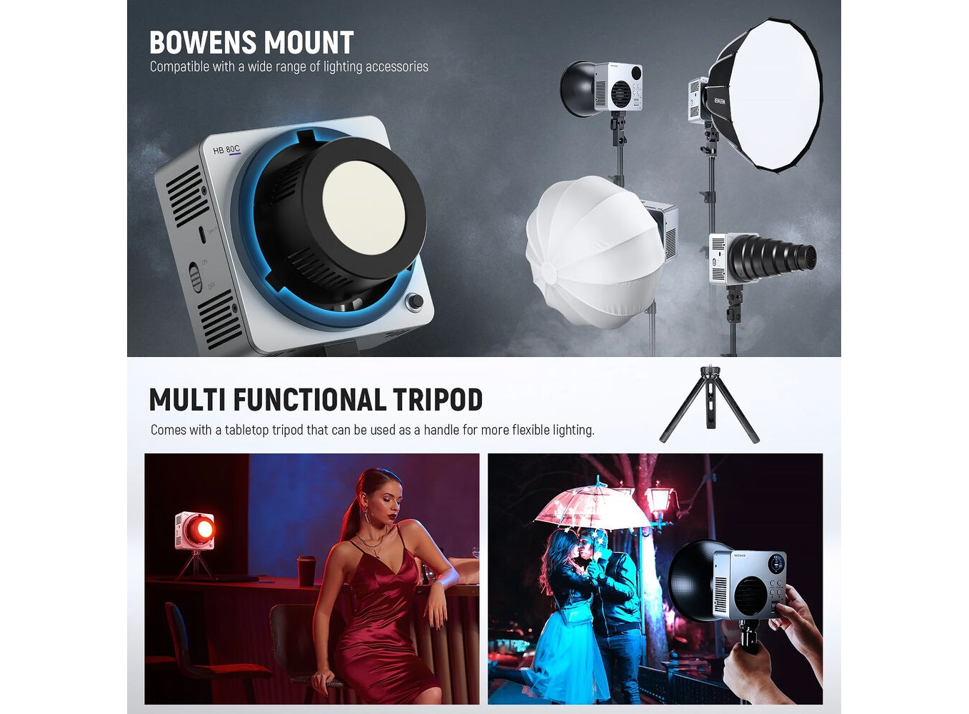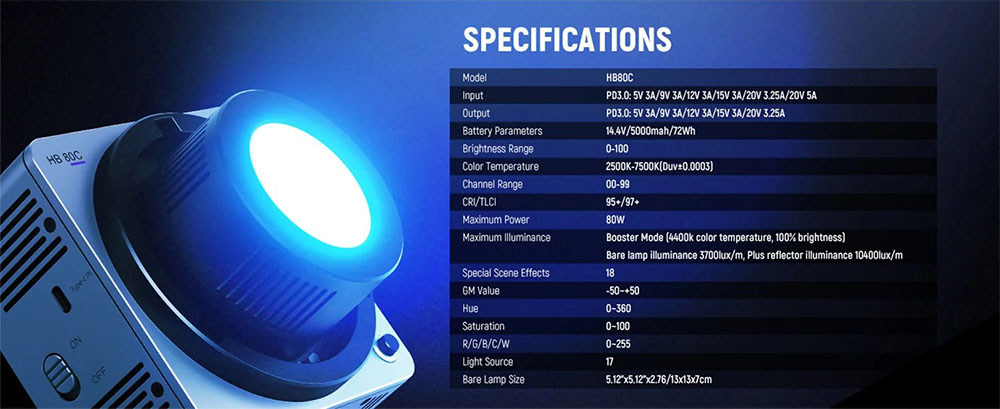 HB80C là đèn RGB mini công suất cao 80W, với khoang trộn ren giúp màu RGB đồng đều hơn, dải nhiệt độ màu rộng 2500K-7500K, GM ± 50 có thể điều chỉnh, chỉ số hoàn màu 95+, nhiệt độ màu 4400K, chế độ tăng cường chiếu sáng của đèn trần 3720lux/m, độ rọi của chóa phản quang 10400lux/m, dải điều chỉnh độ sáng 0-100%. Thời lượng pin tối đa là 70 phút ở chế độ công suất tối đa và 95 phút ở chế độ tắt tiếng.