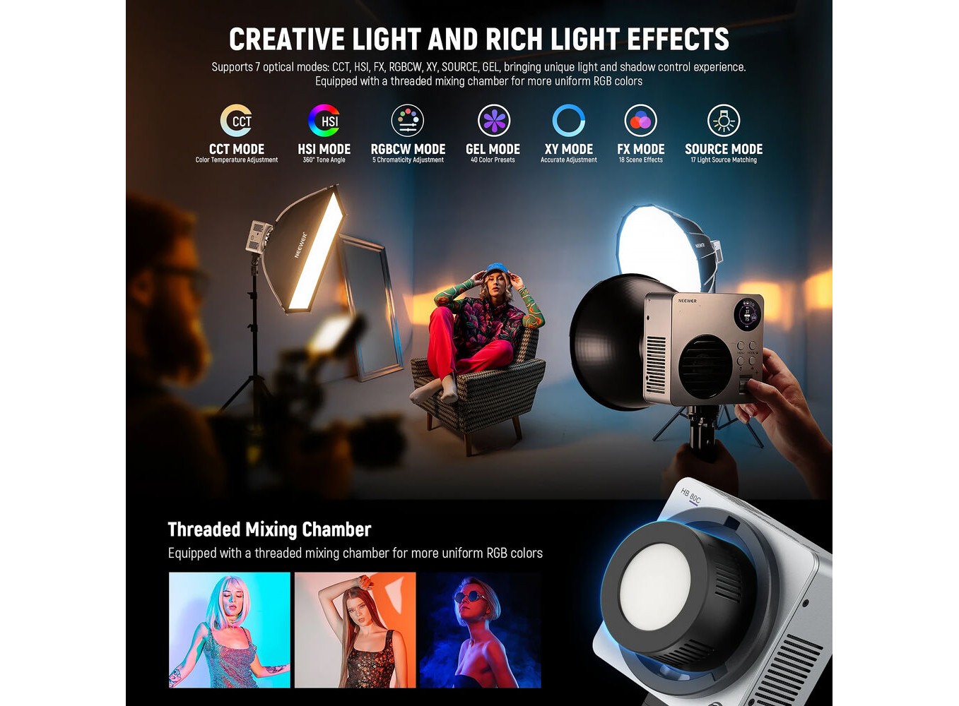 HB80C có 7 chế độ chiếu sáng: CCT/HSI/RGBCW/XY/GEL/Source Match/FX Special Effects Mode. Với chỉ số hoàn màu CRI 95+, TLCI 97+, SSI (D56) ở mức 74, SSI (D32) ở mức 85 và chỉ số Rf/Rg TM-30 là 93/102, sản phẩm mang lại độ chính xác màu sắc tuyệt vời, với dải màu 2500-7500K (Duv ±0.0003) và hiệu chỉnh màu -50/+50 GM để mô phỏng ánh sáng tự nhiên tốt hơn. Sản phẩm còn có khả năng điều khiển toàn bộ sắc độ 0-360°, độ bão hòa 0-100% và 18 hiệu ứng đặc biệt được lập trình sẵn, mang đến nhiều lựa chọn cho các video sáng tạo.