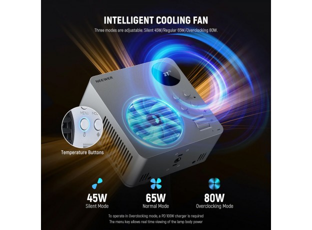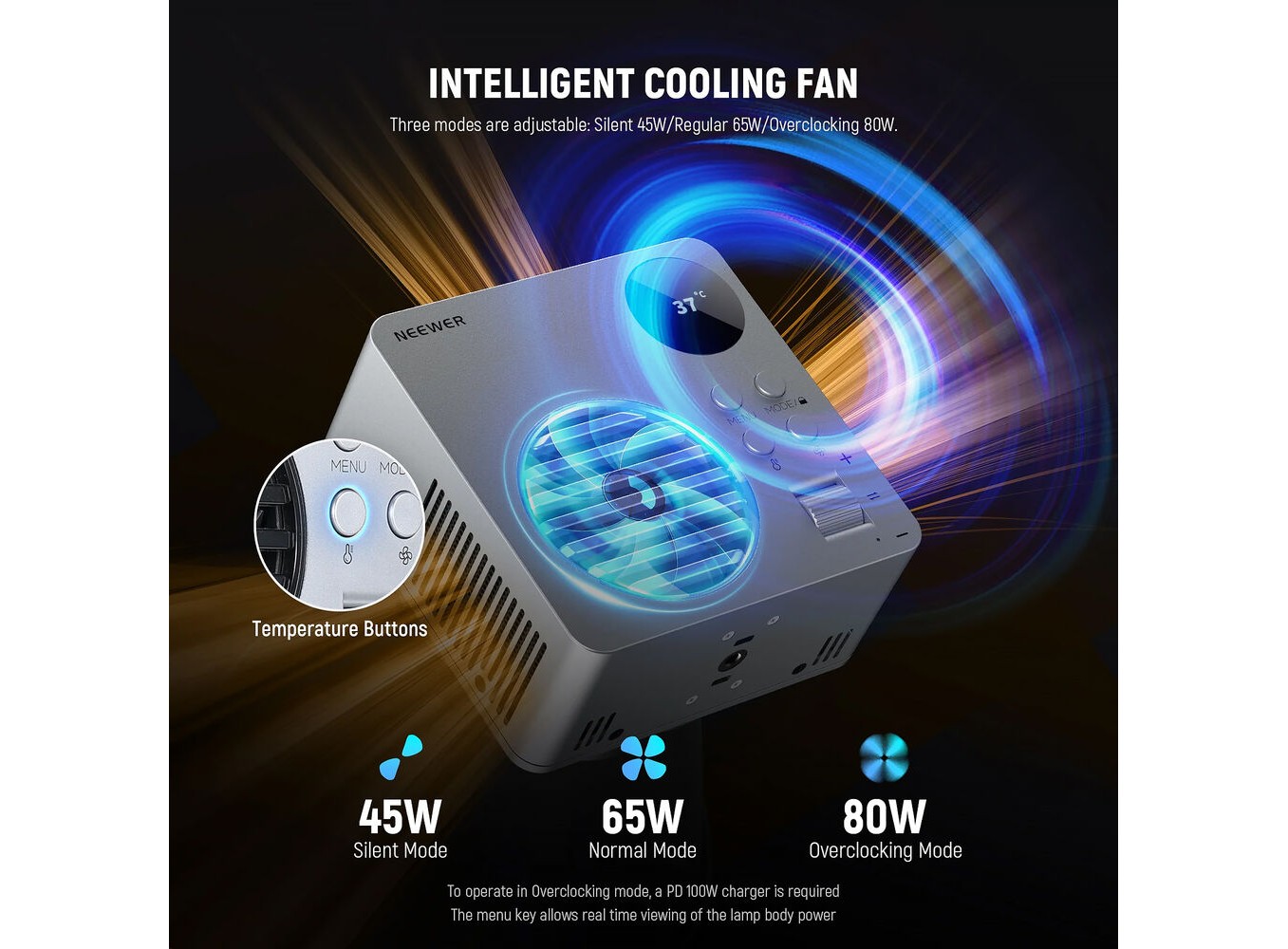 Pin dung lượng cao 72wH tích hợp, được trang bị quạt tản nhiệt chủ động, có thể điều chỉnh ba chế độ (tắt tiếng 45w / thường 65w / tăng cường 80w, chế độ tăng cường yêu cầu sử dụng bộ sạc PD100W), phím menu có thể xem công suất của thân đèn theo thời gian thực; chế độ tắt tiếng kéo dài 1 giờ 35 phút, chế độ thường kéo dài 1 giờ 10 phút (độ sáng 4400K 100%); giao diện hai chiều Type-C, hỗ trợ tối đa đầu vào PD100W, đầu ra 65Wpd, sạc nhanh PD65W, sạc đầy trong 2 giờ, hỗ trợ sạc và xả cùng lúc, không làm hỏng pin, giúp bạn không còn lo lắng về nguồn điện khi chụp ảnh ngoài trời, ghi lại mọi khoảnh khắc tuyệt vời.