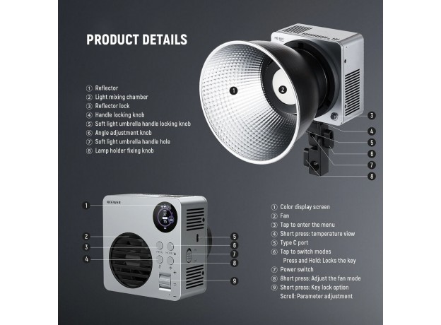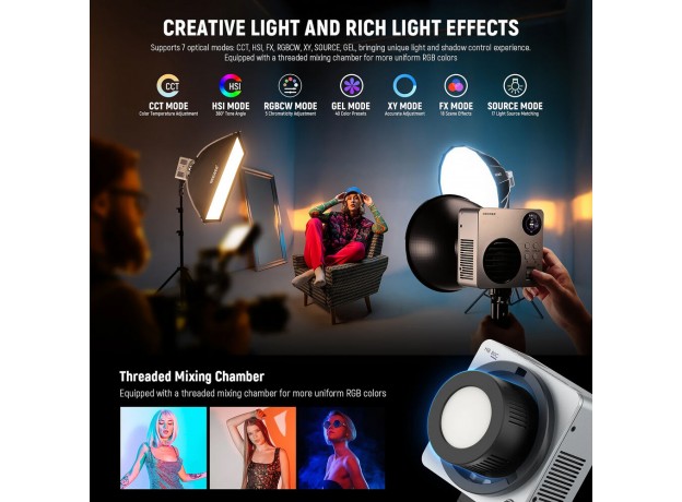 Ngàm Bowens và ổ cắm ô có thể kết nối softbox, đĩa làm đẹp, snoot và dù sáng để tạo ra nhiều hiệu ứng ánh sáng khác nhau. Bộ chuyển đổi gắn chân máy cho phép điều chỉnh góc 360° và chóa đèn tiêu chuẩn giúp tăng cường công suất phát sáng và bảo vệ đèn LED khỏi hư hỏng.