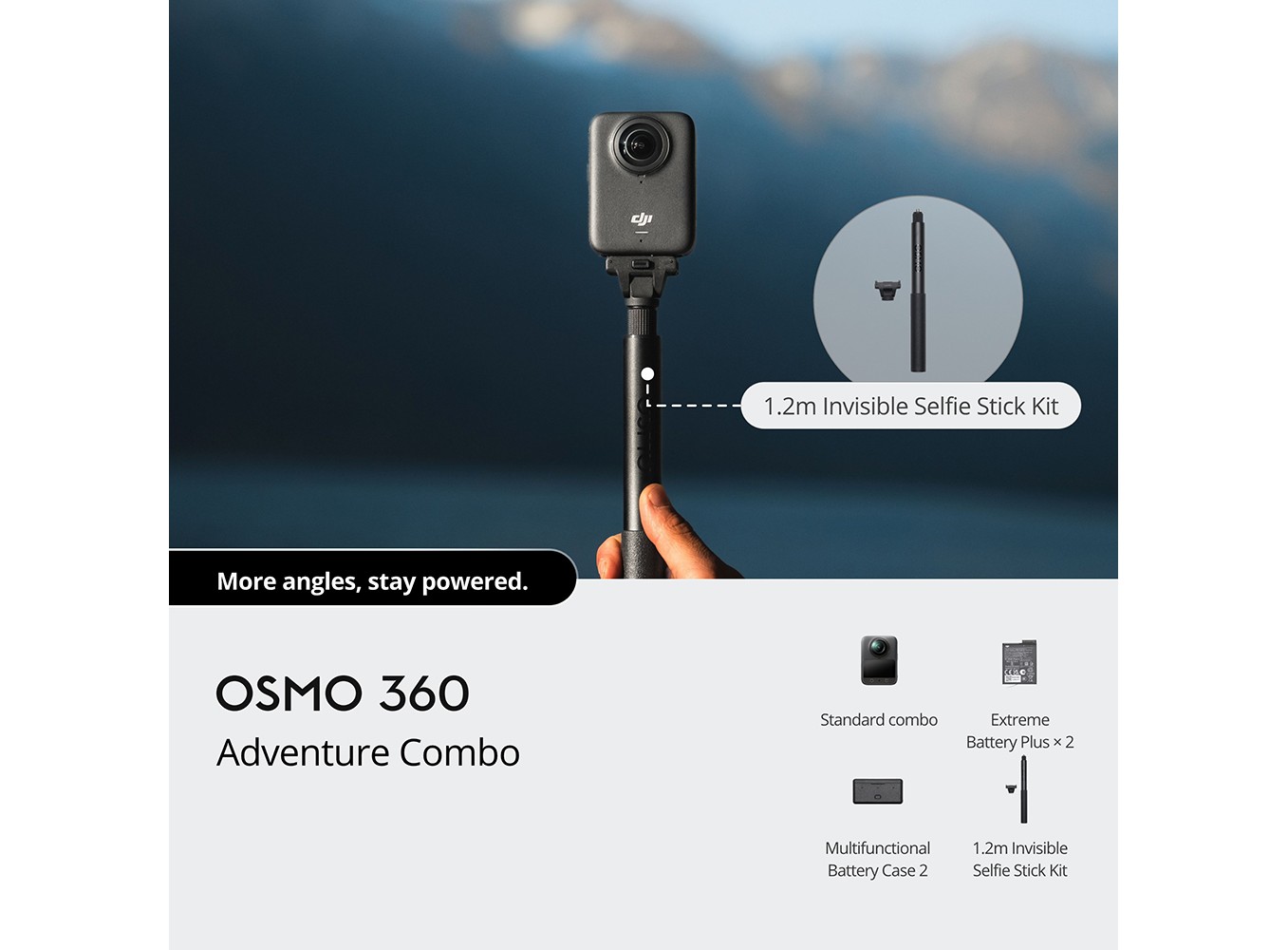 DJI Osmo 360 Adventure Combo bổ sung thêm gậy selfie vô hình 1,2m, hai pin dự phòng Extreme Battery Plus (1950 mAh), hộp đựng pin đa năng 2.