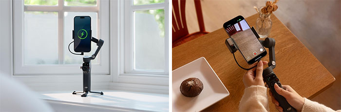 Được trang bị cổng USB-C, Osmo Mobile 8 có thể sạc điện thoại, đặc biệt hữu ích khi quay phim và phát trực tiếp ngoài trời trong thời gian dài.