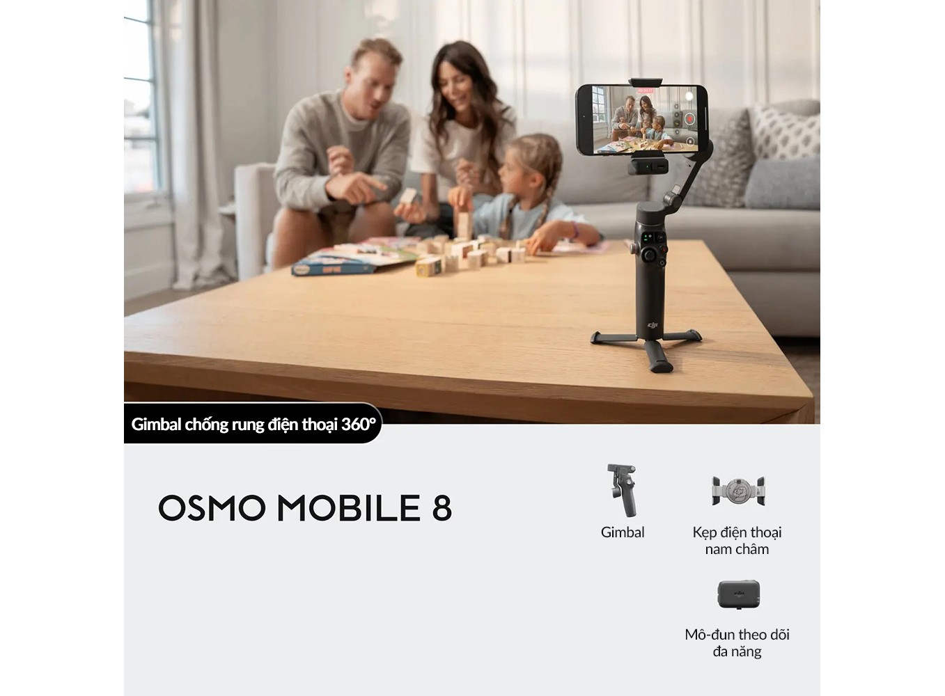 DJI Osmo Mobile 8 hỗ trợ xoay 360° mượt mà và chụp góc thấp. Kết hợp với kết nối trực tiếp với điện thoại, gimal OM8 mang đến cho bạn sự linh hoạt của tính năng theo dõi nguyên bản, giữ những người quan trọng trong khung hình. Mô-đun theo dõi đa chức năng kết hợp theo dõi người và thú cưng, đèn nền và ghi âm. Cho dù bạn đang tạo ảnh selfie, ghi lại cuộc sống hàng ngày hay thậm chí là tổ chức họp video, DJI Osmo Mobile 8 đều có thể khóa chính xác vào chủ thể và ghi lại mọi khoảnh khắc tuyệt vời.