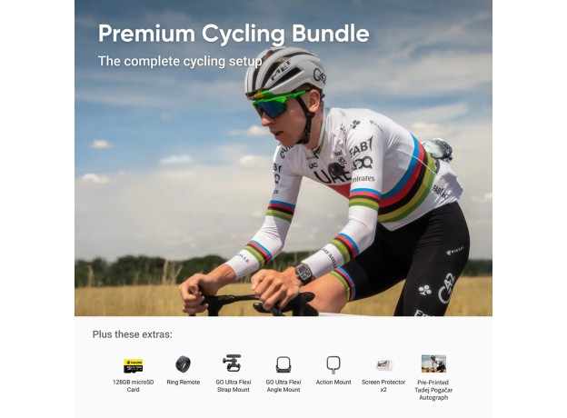 - - Premium Cycling Bundle bổ sung thẻ nhớ microSD 128GB, vòng điều khiển từ xa, giá lắp dây đeo, giá lắp góc, giá lắp Action và 2 bảo vệ màn hình