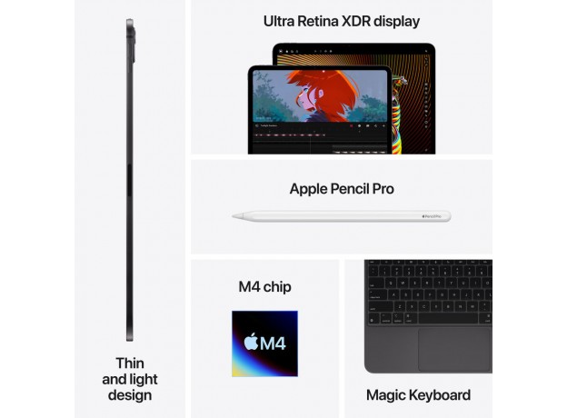 iPad Pro 11" sở hữu thiết kế Pro hoàn toàn mới với độ mỏng chỉ 5,3mm và gọn nhẹ ấn tượng, trang bị màn hình Ultra Retina XDR tiên tiến hàng đầu cung cấp độ sáng cực đỉnh và độ tương phản chuẩn xác. Lần đầu giới thiệu chip mới Apple M4 đáp ứng hiệu năng mạnh mẽ, đồ họa vượt trội và năng lực AI hiện đại, mang đến khả năng xử lý nhanh gọn cho những luồng công việc chuyên nghiệp với iPadOS và các ứng dụng tuyệt vời. Nay tương thích với phụ kiện Apple Pencil Pro hoàn toàn mới để nâng tầm sáng tạo hơn nữa.