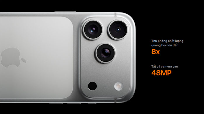 iPhone 17 Pro Max sở hữu hệ thống camera tốt nhất từ ​​trước đến nay của Apple với cảm biến trước và sau có độ phân giải cao hơn — tương đương với việc người dùng có tới tám ống kính chuyên nghiệp trong túi. Ba camera Fusion 48MP chụp ảnh sắc nét và chi tiết hơn. Camera Telephoto 48MP mới sở hữu thiết kế tetraprism thế hệ mới với cảm biến lớn hơn 56% so với thế hệ trước, giúp cải thiện độ sắc nét trong điều kiện ánh sáng mạnh và mang lại nhiều chi tiết hơn cho ảnh chụp tối.