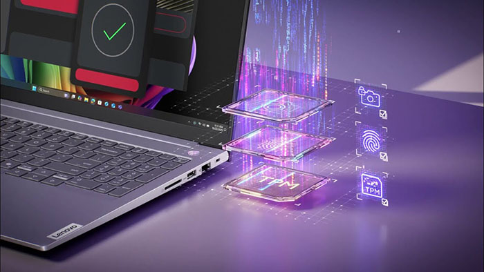 Tăng cường bảo vệ dữ liệu số của bạn với máy tính xách tay ThinkBook 14 Gen 8. Firmware Trusted Platform Module (fTPM) đảm bảo mã hóa dữ liệu mạnh mẽ, trong khi đầu đọc dấu vân tay Match-on-Host (MOH) tùy chọn, được tích hợp vào nút nguồn, cho phép đăng nhập an toàn và khởi động ngay lập tức. Ngoài ra, màn che riêng tư webcam cung cấp thêm một lớp bảo vệ.