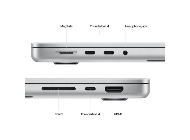 Truyền ảnh và video bằng khay đọc thẻ SDXC. Kết nối với TV hoặc màn hình bằng cổng ra HDMI nay hỗ trợ đến 8K. Cắm phụ kiện và màn hình rời qua ba cổng Thunderbolt 4. Kết nối cáp nguồn nhanh và bảo vệ máy với MagSafe 3. Sạc nhanh MacBook Pro tới 50% pin chỉ trong 30 phút.
