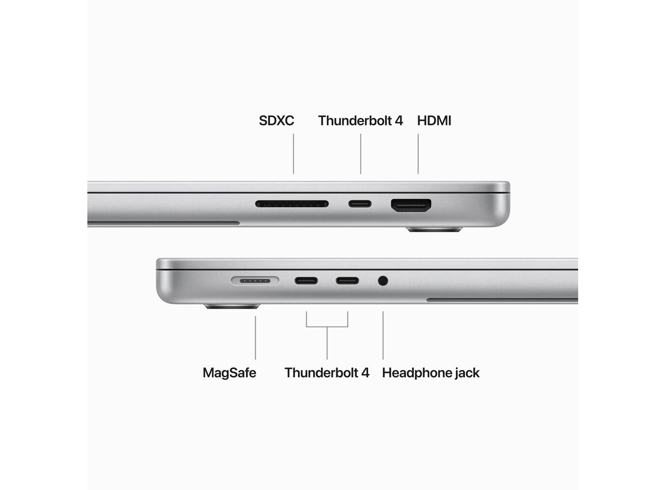 MacBook Pro có dãy cổng kết nối mạnh mẽ để kết nối với thiết bị ngoại vi tốc độ cao cũng như màn hình độ phân giải cao, hoặc trực tiếp chuyển dữ liệu từ thẻ SDXC sang máy. Đồng thời hỗ trợ cả Wi‑Fi 6E và Bluetooth 5.3.