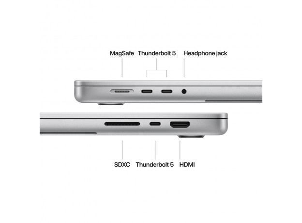 • - 7 cổng: 3x Thunderbolt 5 (USB‑C), HDMI, SDXC, giắc cắm tai nghe, MagSafe