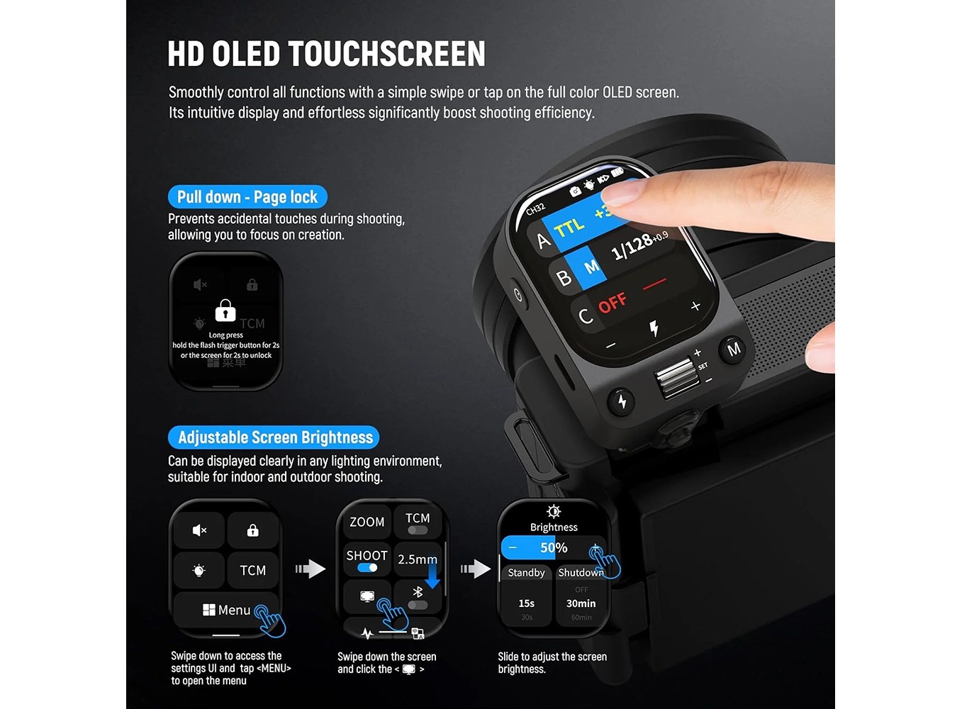 Neewer QZ là bộ kích hoạt đèn flash chuyên nghiệp với màn hình cảm ứng sở hữu màn hình cảm ứng OLED với độ sáng có thể điều chỉnh và cho phép điều khiển bằng nút bấm ngay cả khi đeo găng tay vào mùa đông. Hỗ trợ đèn flash tự động TTL, đồng bộ tốc độ cao 1/8000 giây, bù trừ phơi sáng đèn flash (FEC), đèn flash thủ công, công tắc TCM một lần nhấn, đèn flash chớp, điều khiển đèn tạo mẫu, zoom, kích hoạt một điểm, điều khiển nhóm...