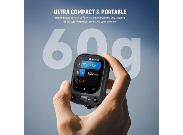 Cò đèn flash được trang bị pin lithium 3.7V 1000mAh, sạc đầy trong 2,5 giờ bằng cáp USB sang Type C đi kèm (không bao gồm bộ chuyển đổi). Ngoài ra còn có màn hình hiển thị mức pin giúp bạn theo dõi trạng thái pin nhanh chóng và hỗ trợ nâng cấp firmware qua cổng Type C. Kích thước nhỏ gọn 64 x 41 x 38mm và trọng lượng nhẹ 60g giúp bạn dễ dàng mang theo và sử dụng lâu dài như một thiết bị chụp ảnh thiết yếu của người sáng tạo nội dung và người có sức ảnh hưởng.