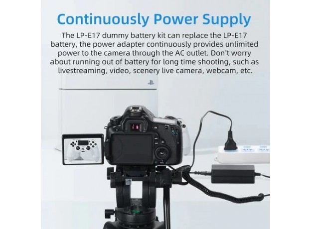 Bộ sản phẩm bao gồm dây cắm nguồn trực tiếp vào điện thế 220V, bộ chuyển đổi DC chuyển đầu vào chuẩn 8.4V, một viên pin chuẩn mã LP-E17 tương thích với các dòng máy ảnh Canon RP 77D 850D 800D 760D 750D 200D II 200D...
