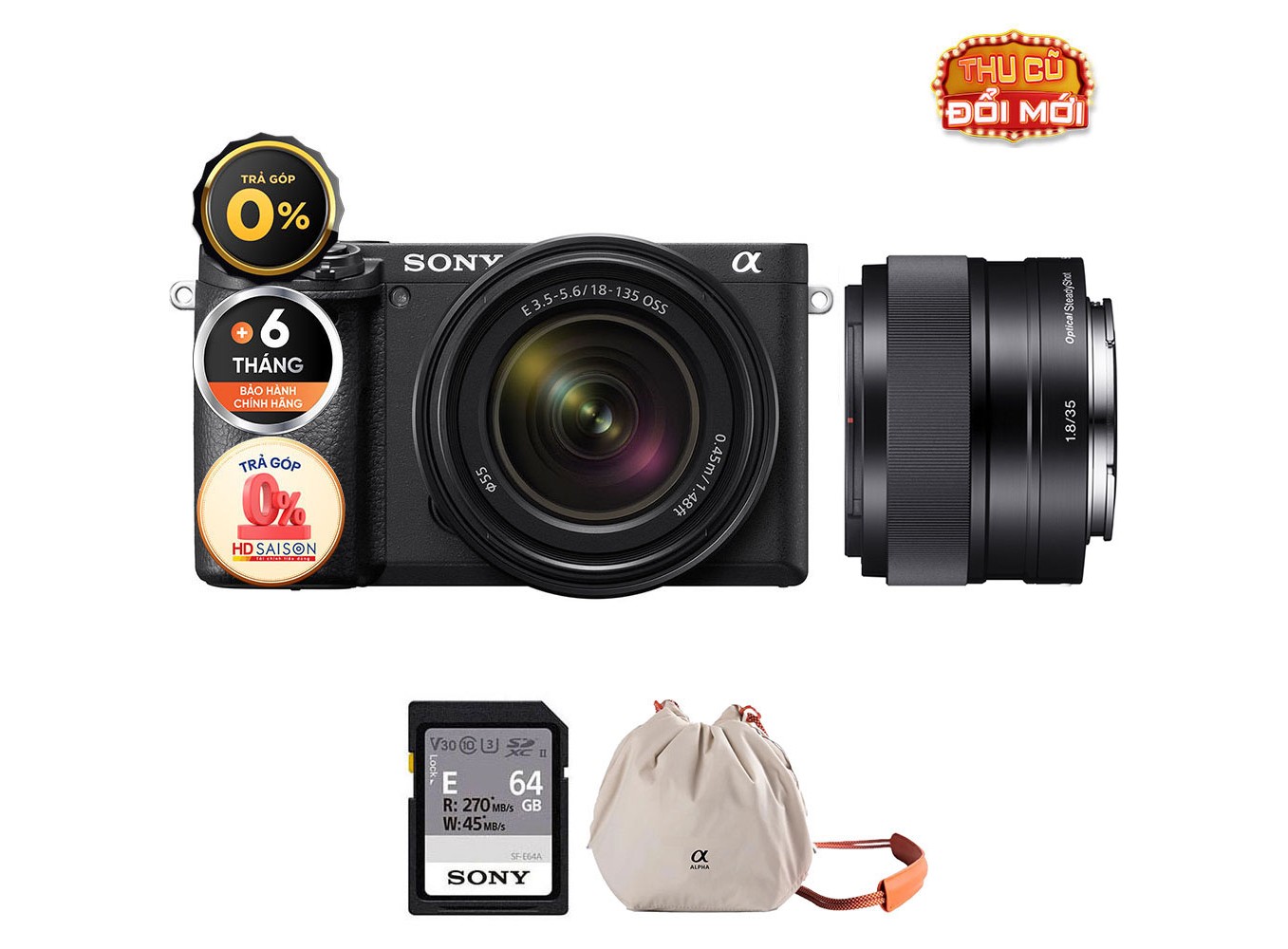 Sony A6400 + E 35mm f/1.8 (Chính hãng) (Kit 18-135mm + Sony E 35mm f/1.8, Thẻ Nhớ 64GB + Túi Máy Ảnh)