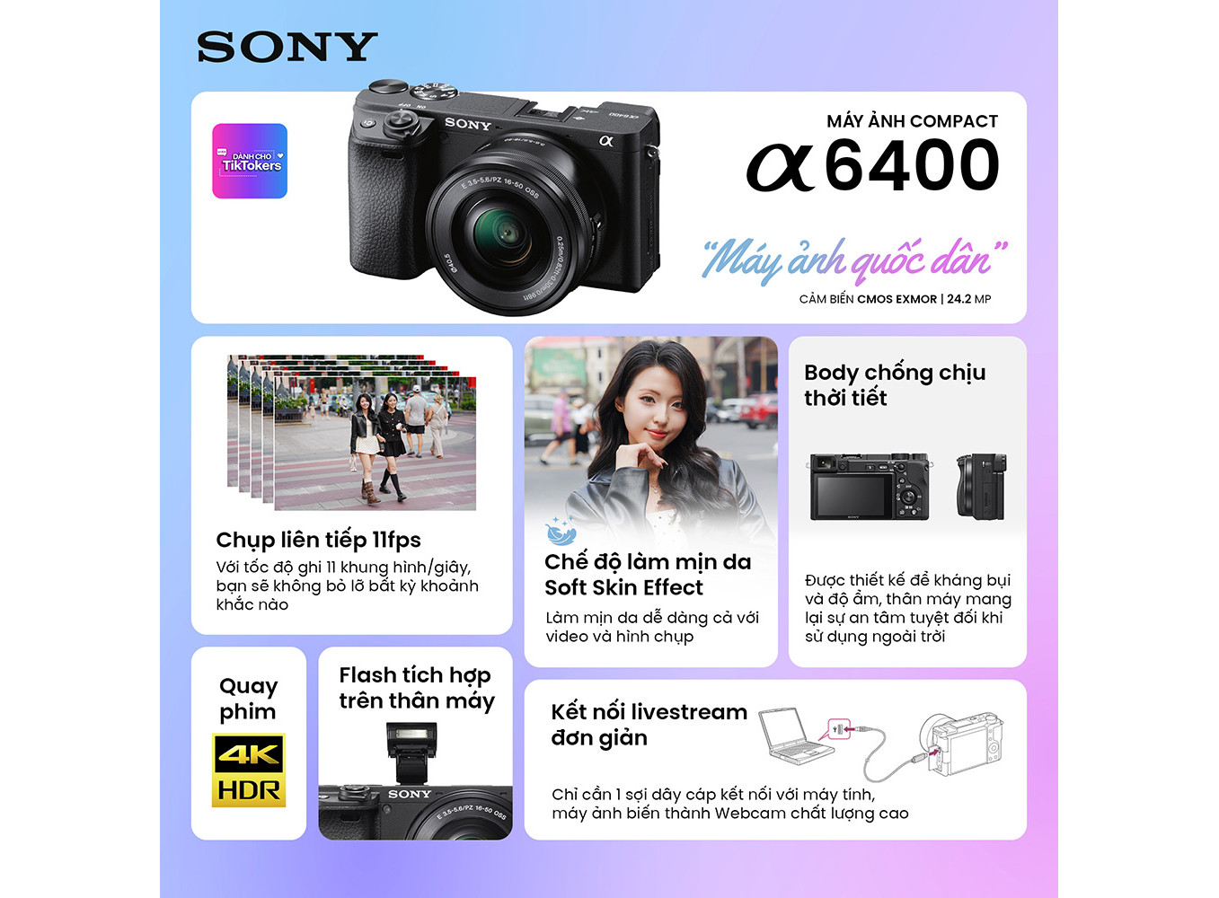 Trái ngược vẻ ngoài nhỏ gọn và trọng lượng nhẹ, máy ảnh APS-C Sony a6400 mang đến hiệu suất tốc độ và bộ tính năng tuyệt vời có thể sánh ngang dòng máy ảnh full frame. Dù là chụp ảnh tĩnh hay quay phim, bố cục sáng tạo hay selfie hàng ngày, máy ảnh a6400 cho phép bạn tận hưởng mọi khung hình mãn nhãn nhất để bạn luôn có thể chia sẻ chúng đi bất cứ đâu.