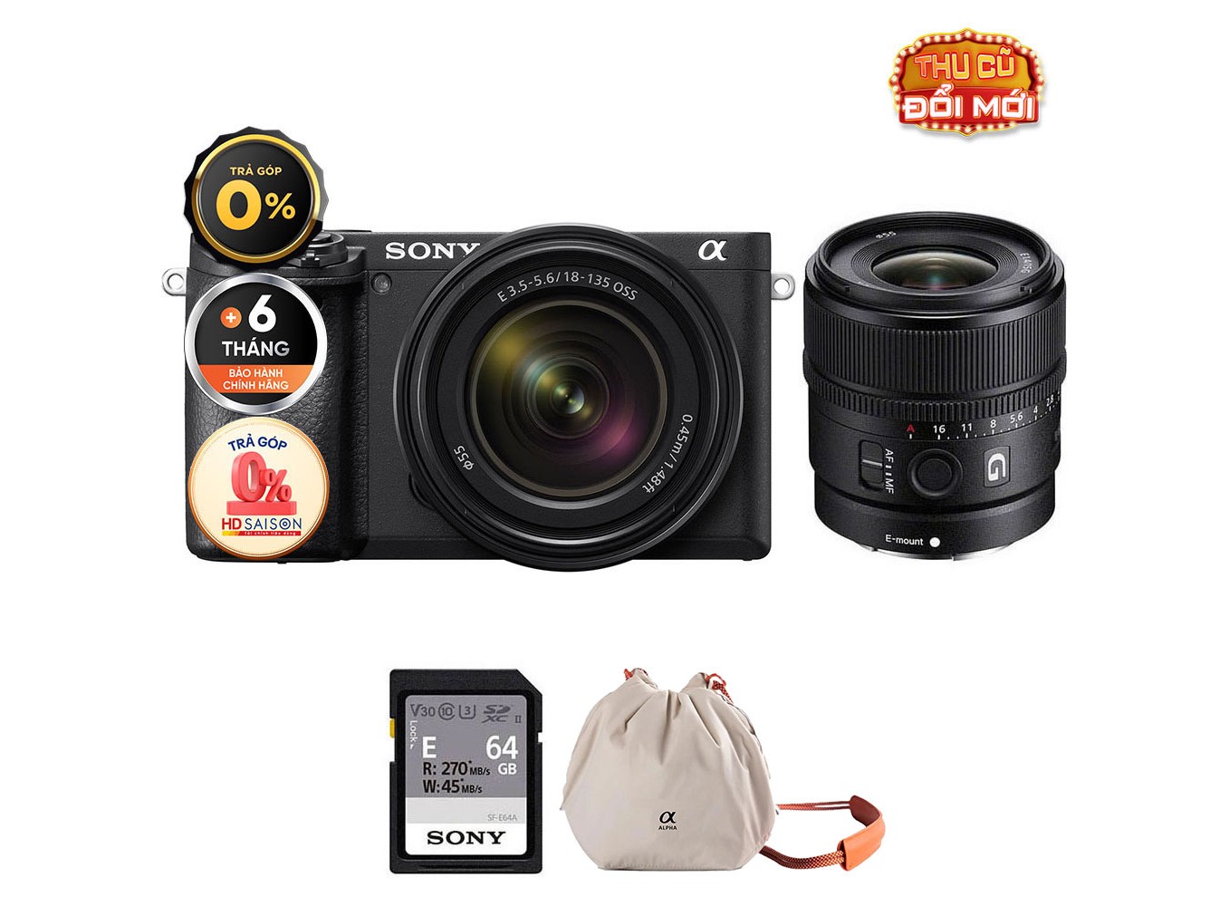 Sony A6400 + E 15mm f/1.4 G (Chính hãng) (Kit 18-135mm + Sony E 15mm f/1.4, Thẻ Nhớ 64GB + Túi Máy Ảnh)
