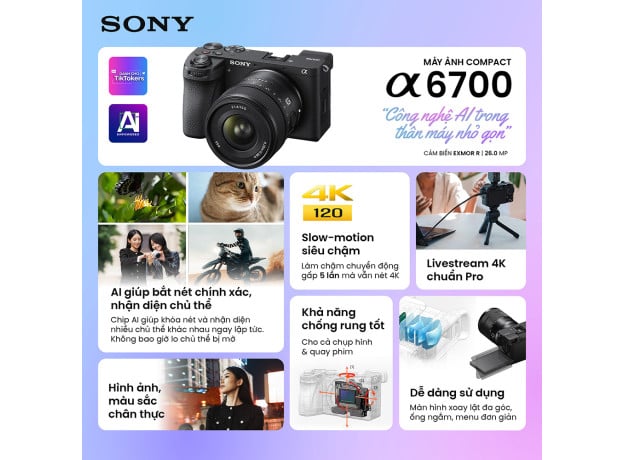 Sony A6700 là tổng hòa các cải tiến của dòng Cinema Line, chất lượng biểu đạt ảnh tĩnh của dòng Alpha và những tiến bộ trong công nghệ nhận dạng dựa trên AI, mang đến khả năng chụp ảnh mạnh mẽ và linh hoạt cho người sáng tạo nội dung trong thiết kế nhỏ gọn. Máy ảnh Sony A6700 được hỗ trợ bởi cảm biến Exmor R CMOS BSI 26.0MP mới nhất và chip xử lý BIONZ XR, máy ảnh A6700 có khả năng chụp ảnh tĩnh liên tục 11 hình/giây và quay video 4K UHD lấy dư mẫu từ độ phân giải 6K, biến nó trở thành công cụ đáng gờm cho nhu cầu sáng tạo đa năng.