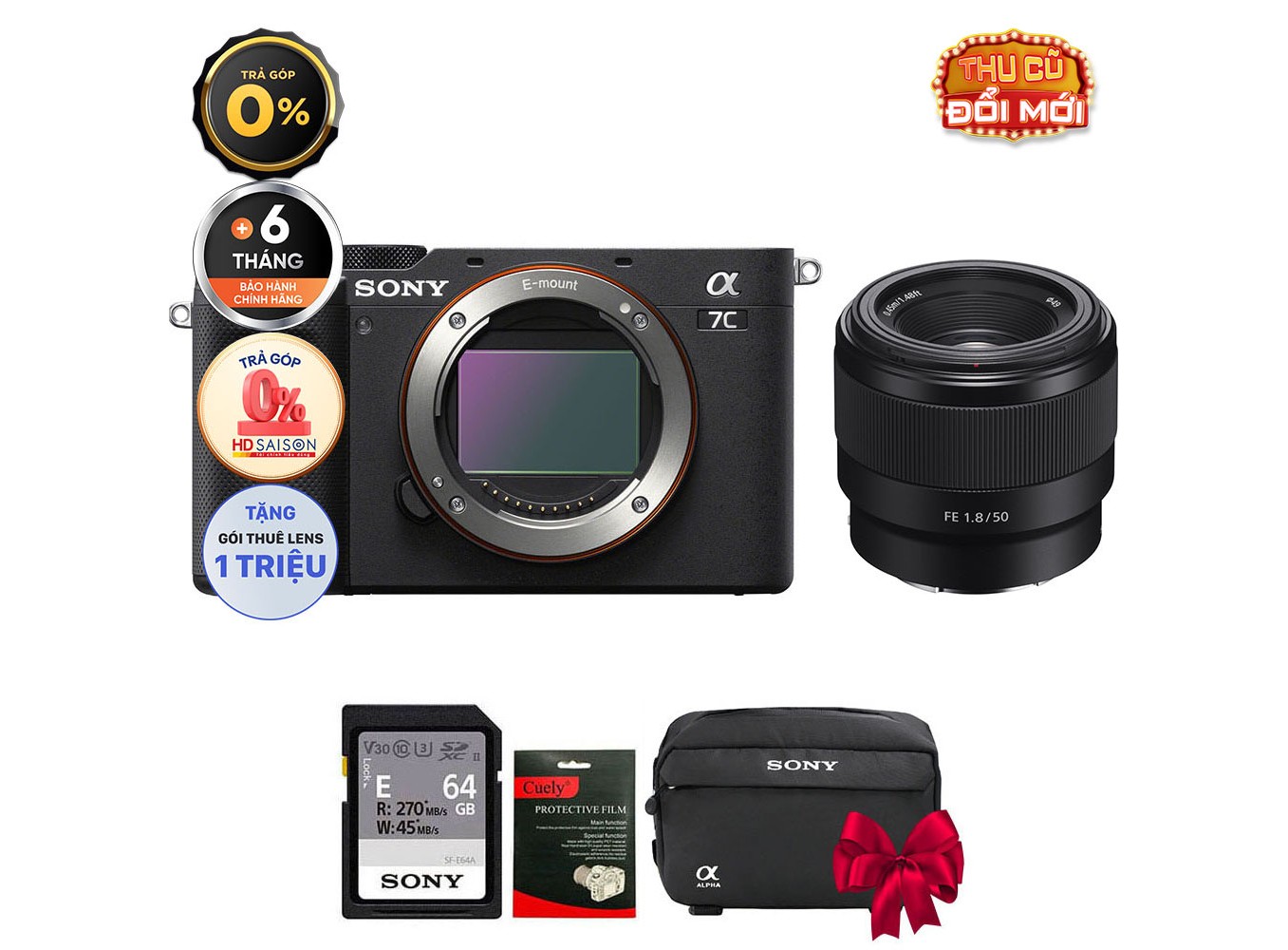 Sony A7C (Chính hãng) (Kèm Lens Sony FE 50mm f/1.8, Black, Thẻ Nhớ 64GB + Túi Máy Ảnh)