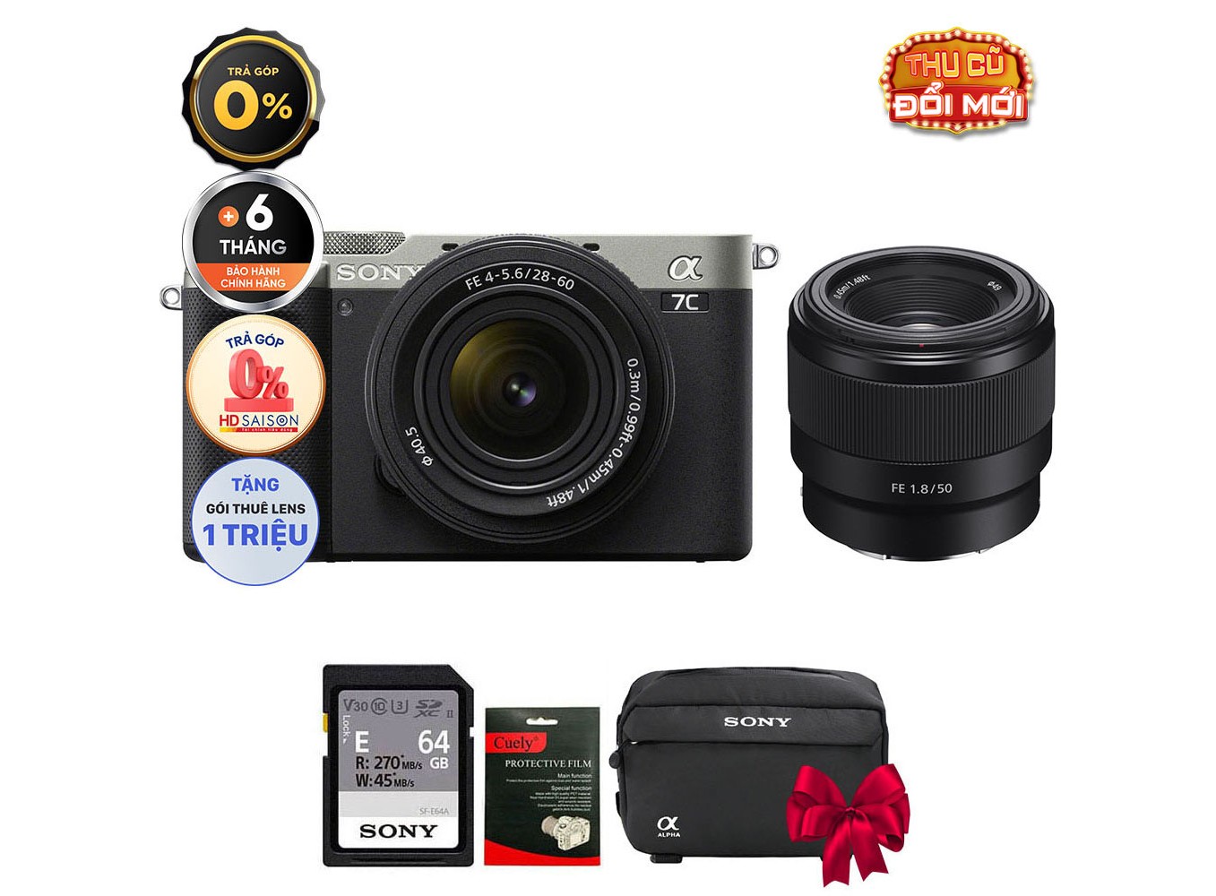 Sony A7C (Chính hãng) (Kèm Kit Lens 28-60mm + Sony FE 50mm f/1.8, Silver, Thẻ Nhớ 64GB + Túi Máy Ảnh)
