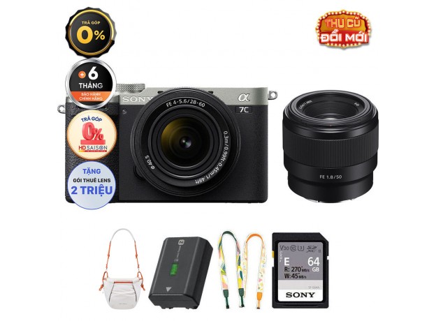Sony A7C II (Chính hãng) (Kèm Kit Lens 28-60mm + Sony FE 50mm f/1.8, Silver, Pin + Thẻ Nhớ 64GB + Dây Đeo + Túi Máy Ảnh)