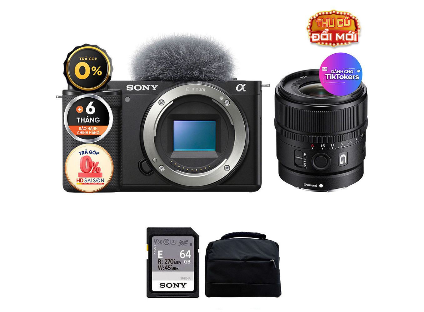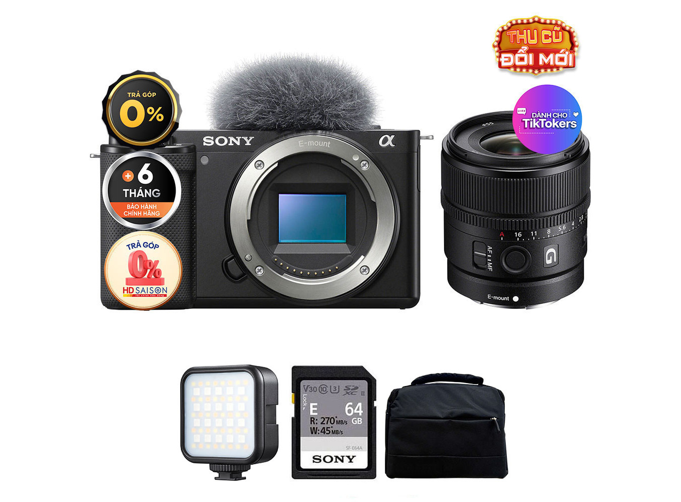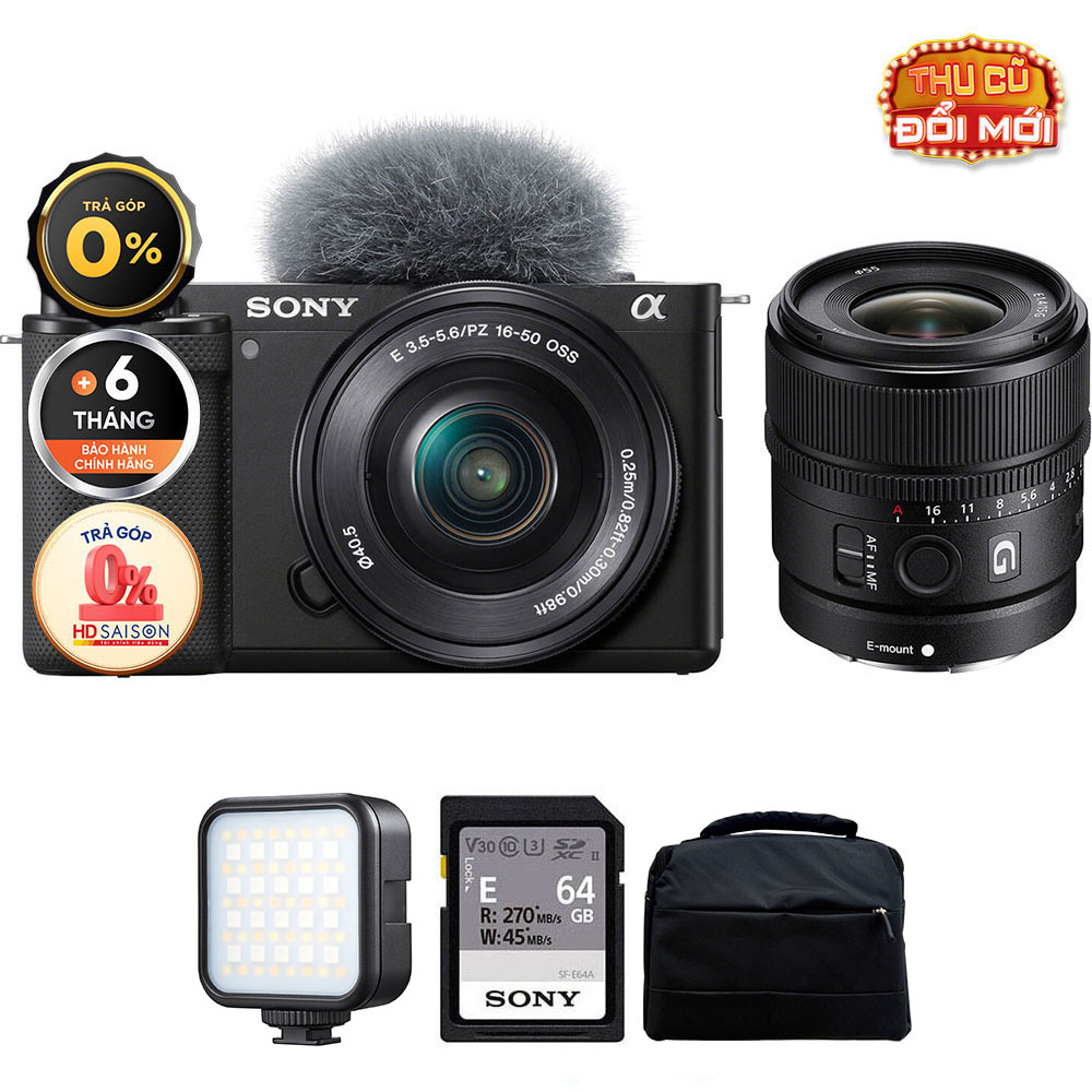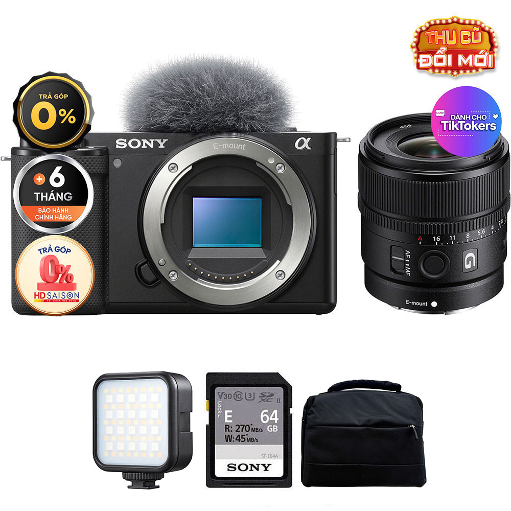 Sony ZV-E10 + E 15mm f/1.4 G (Chính hãng) (Body + Sony E 15mm f/1.4, Thẻ Nhớ 64GB + Túi Máy Ảnh + Đèn LED)