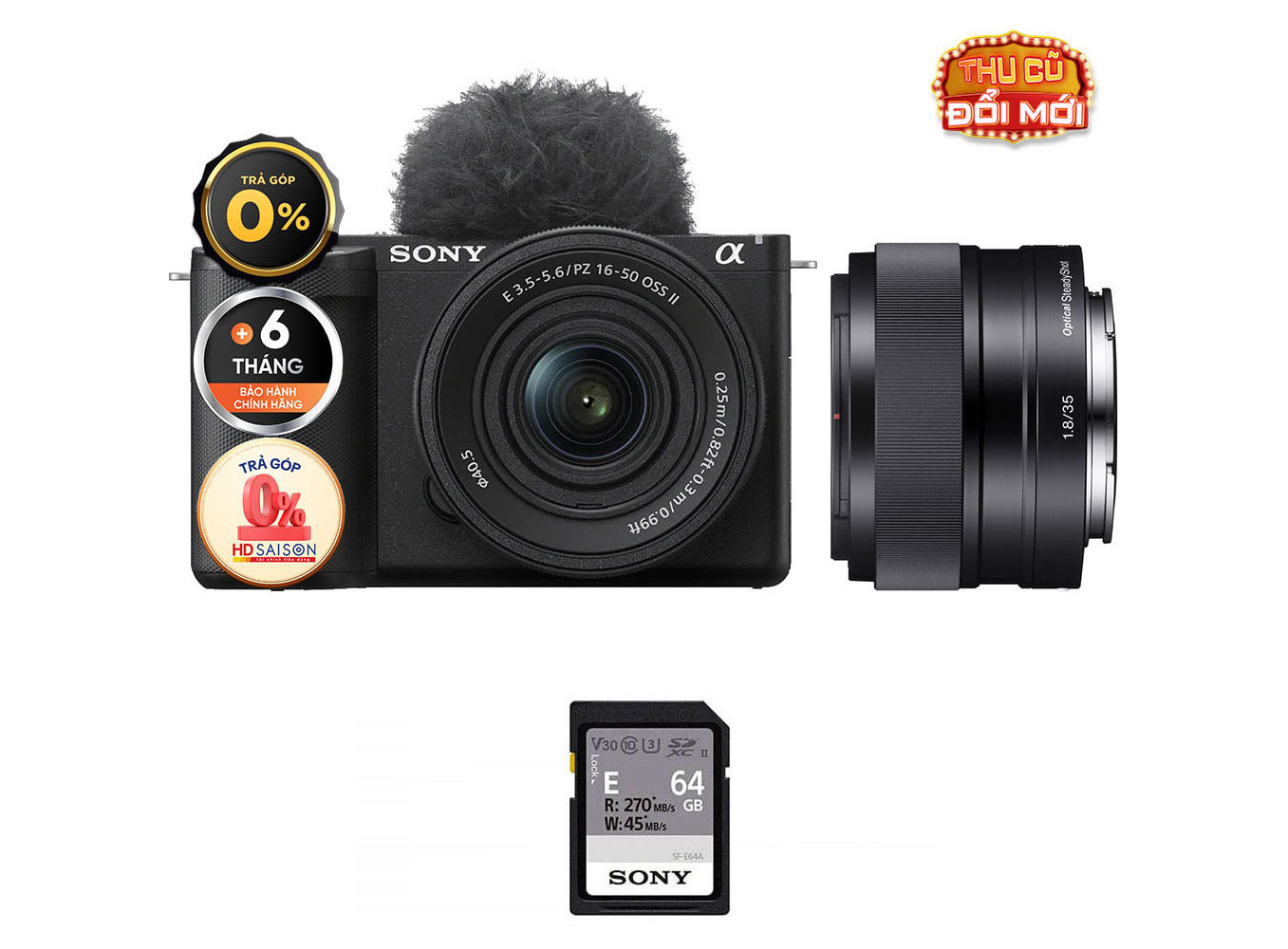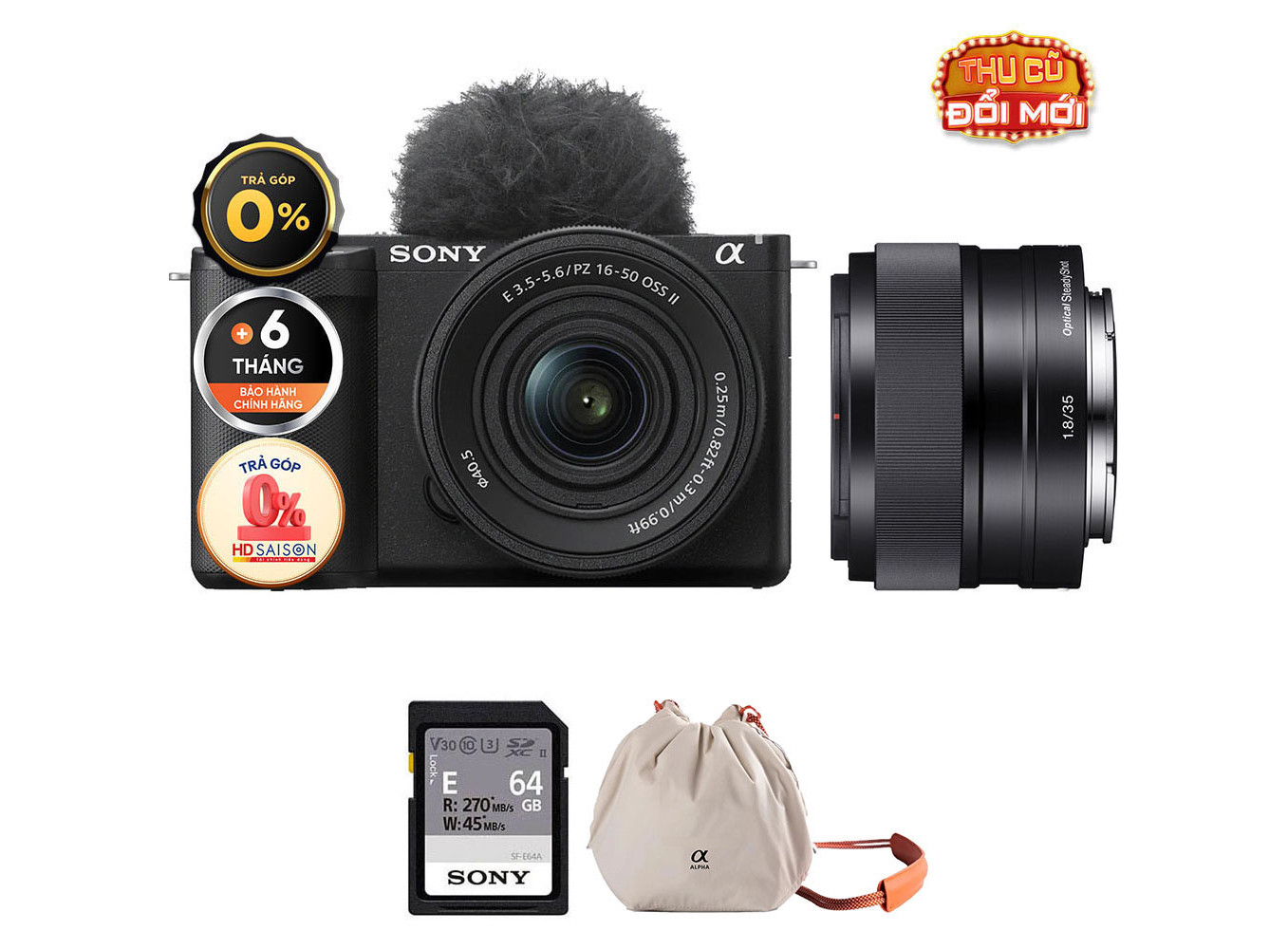 Sony ZV-E10 II + E 35mm f/1.8 (Chính hãng) (Kit 16-50mm II + Sony E 35mm f/1.8, Black, Thẻ Nhớ 64GB + Túi Máy Ảnh)