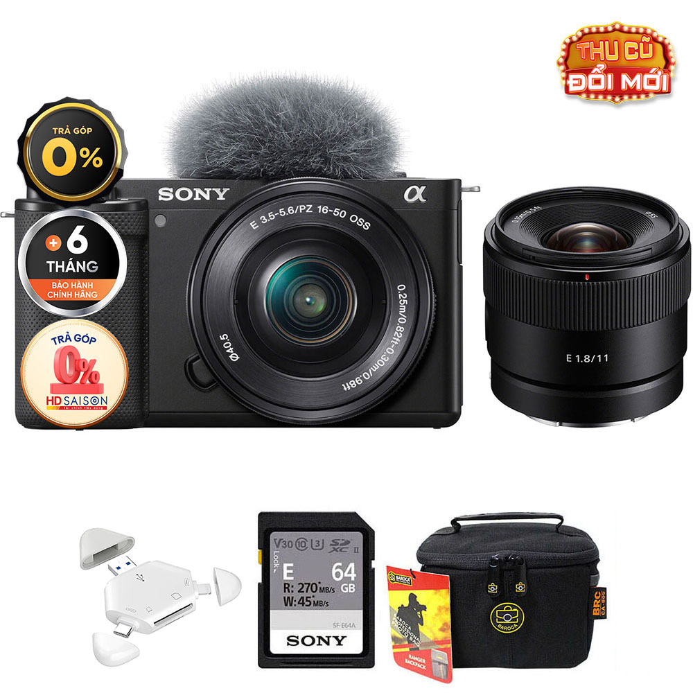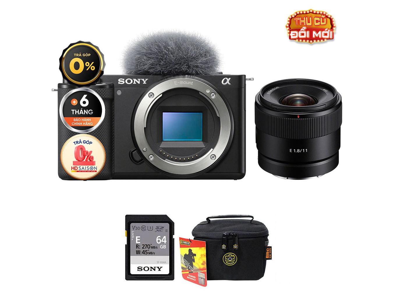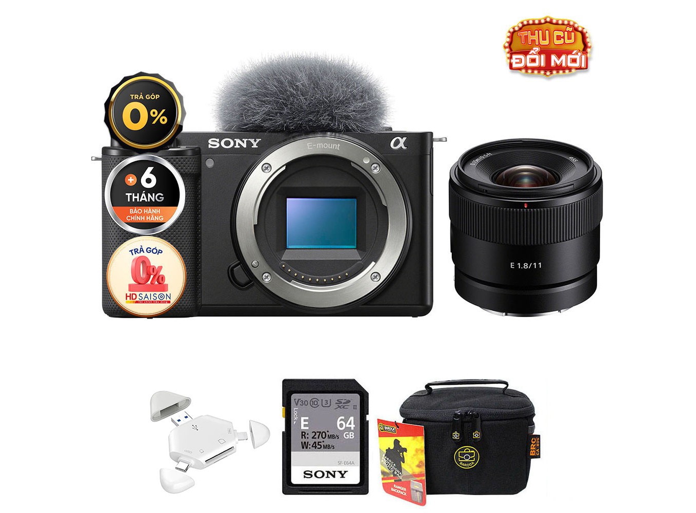Sony ZV-E10 + E 11mm f/1.8 (Chính hãng) (Body + Sony E 11mm f/1.8, Đầu Đọc Thẻ + Thẻ Nhớ 64GB + Túi Máy Ảnh)