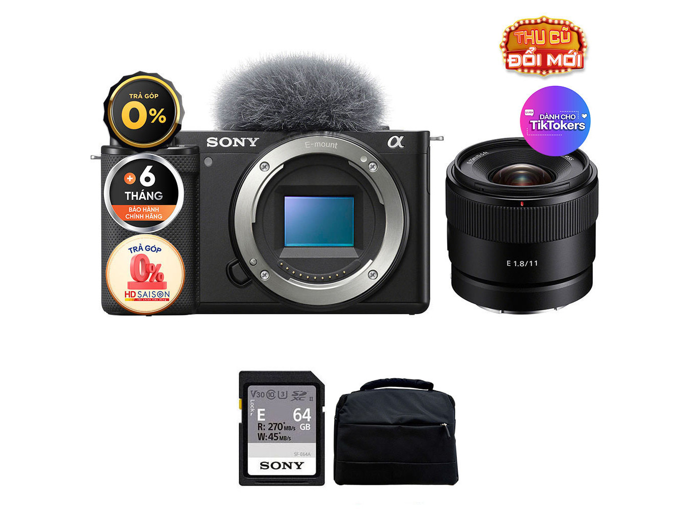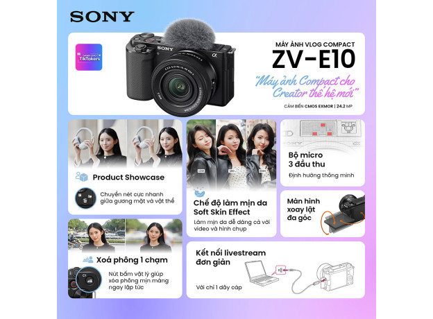 Sony ZV-E10 + Kit 16-50mm kết hợp cảm biến APS-C lớn và tính linh hoạt của dòng mirrorless với một bộ tính năng riêng biệt hoàn hảo dành cho các vlogger và nhà sáng tạo nội dung. Đáp ứng chất lượng hình ảnh cao, nhiều lựa chọn ống kính đa dạng và kiểm soát tốt hơn để bạn luôn sáng tạo khi quay chụp.