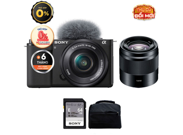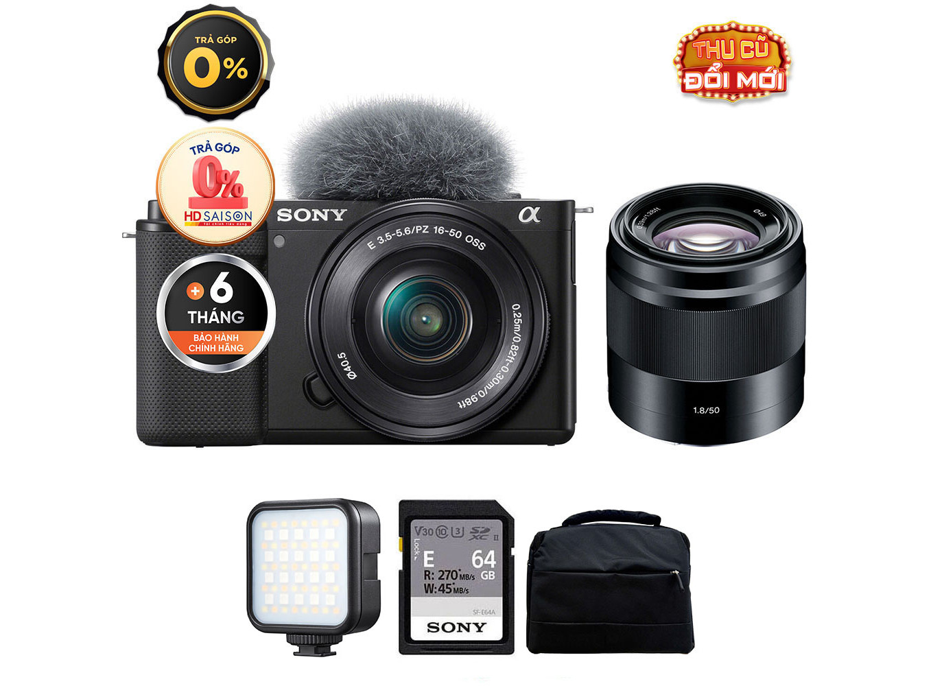 Sony ZV-E10 (Chính hãng) (Kèm Kit Lens 16-50mm + Sony E 50mm f/1.8 OSS, Black, Thẻ Nhớ 64GB + Túi Máy Ảnh + Đèn LED)